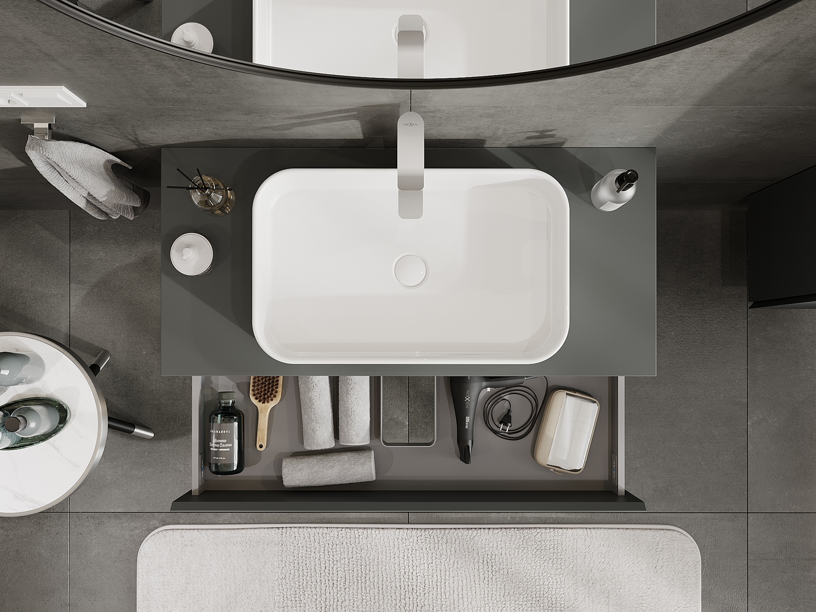 Decupajul în sertar este proiectat în așa fel încât să acomodeze sifonul, care este esențial în instalațiile de lavoare. Datorită acestui fapt, mobila poate fi montată complet funcțională, fără a fi necesară renunțarea la spațiul din sertar în favoarea instalației.