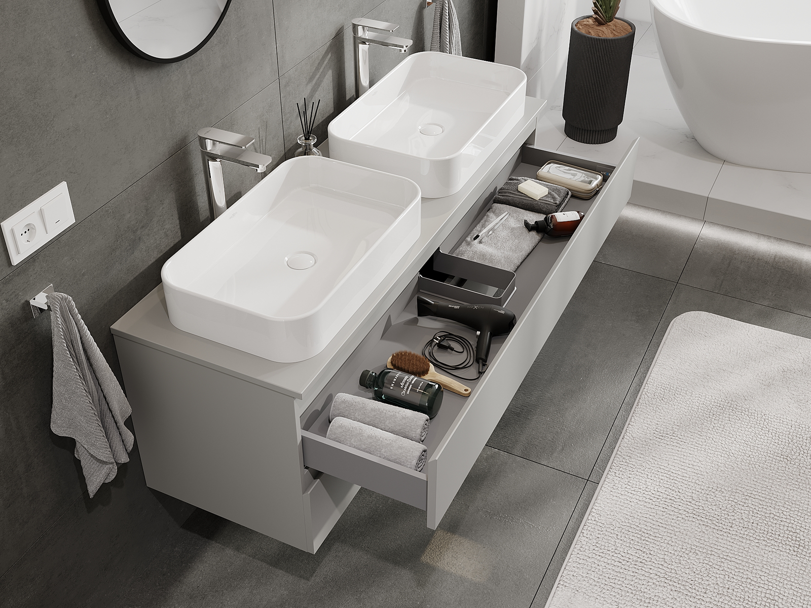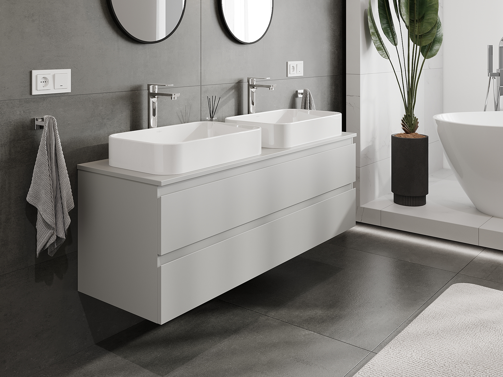 Mobilierul nostru modular pentru baie poate fi combinat în diverse configurații de culori, permițând personalizarea completă. Puteți alege atât aspectul, cât și funcțiile fiecărui element, ceea ce permite adaptarea mobilierului la preferințele dvs. stilistice și funcționale.