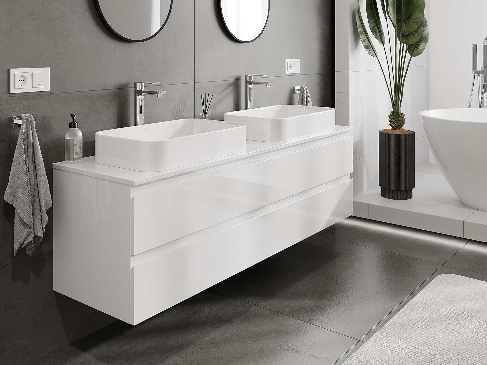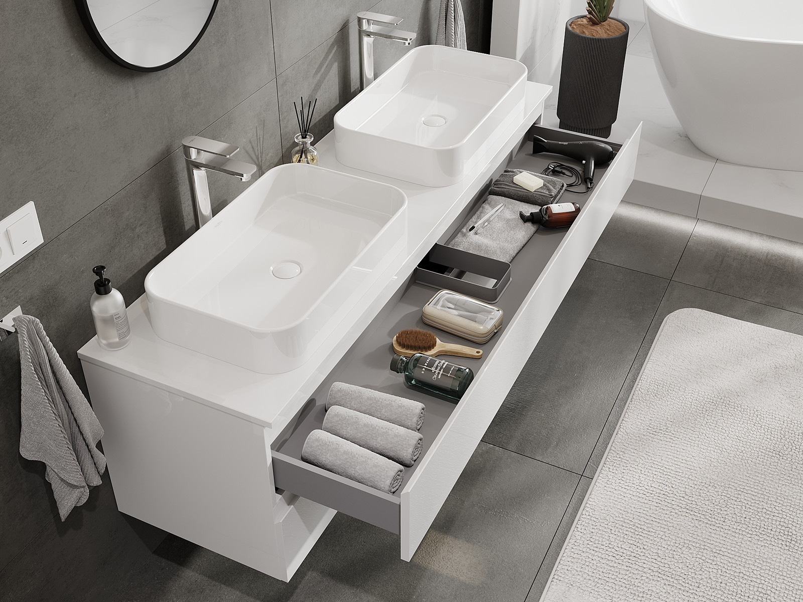 Mobilierul nostru modular pentru baie poate fi combinat în diverse configurații de culori, permițând personalizarea completă. Puteți alege atât aspectul, cât și funcțiile fiecărui element, ceea ce permite adaptarea mobilierului la preferințele dvs. stilistice și funcționale.