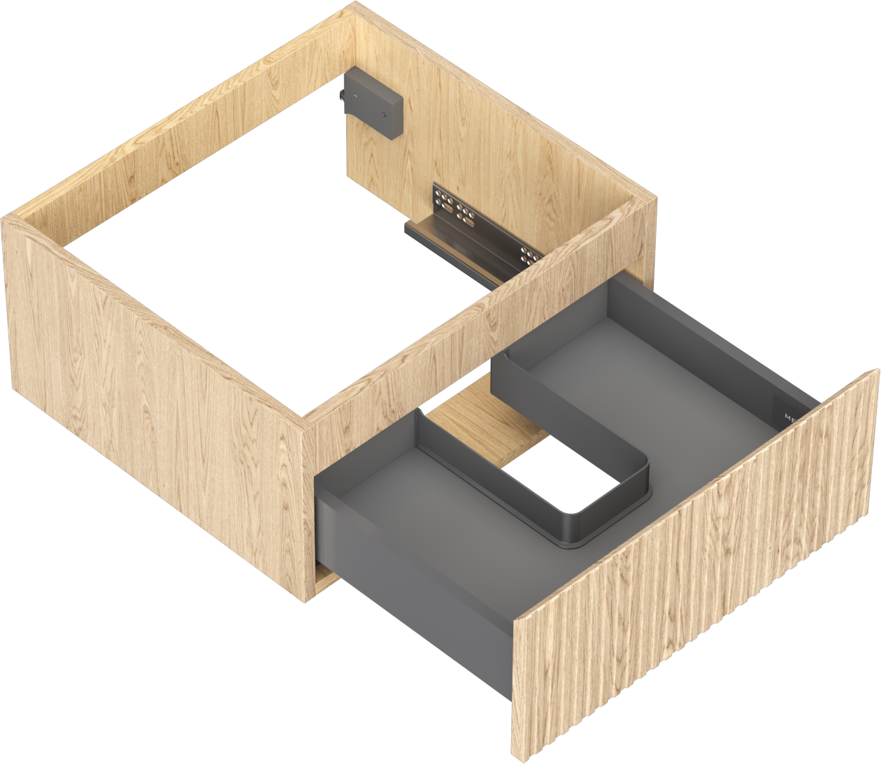Decupajul în sertar este proiectat în așa fel încât să acomodeze sifonul, care este esențial în instalațiile de lavoare. Datorită acestui fapt, mobila poate fi montată complet funcțională, fără a fi necesară renunțarea la spațiul din sertar în favoarea instalației.