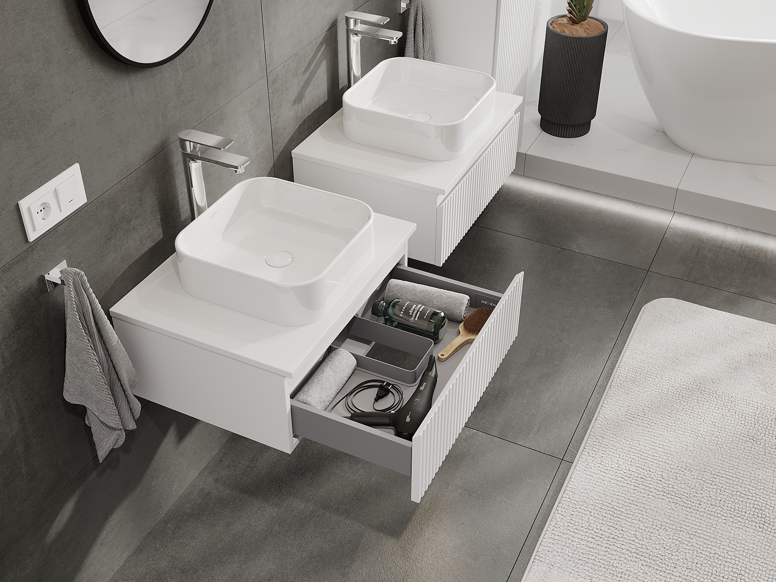 Mobilierul nostru modular pentru baie poate fi combinat în diverse configurații de culori, permițând personalizarea completă. Puteți alege atât aspectul, cât și funcțiile fiecărui element, ceea ce permite adaptarea mobilierului la preferințele dvs. stilistice și funcționale.