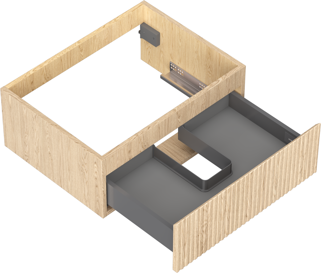 Decupajul în sertar este proiectat în așa fel încât să acomodeze sifonul, care este esențial în instalațiile de lavoare. Datorită acestui fapt, mobila poate fi montată complet funcțională, fără a fi necesară renunțarea la spațiul din sertar în favoarea instalației.