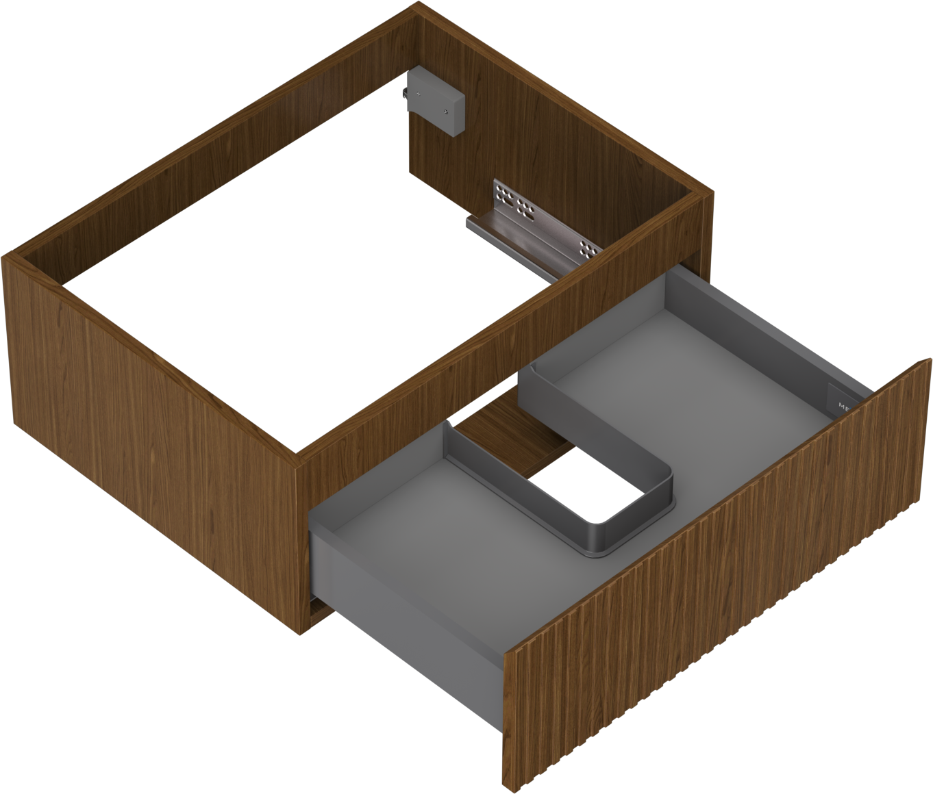 Decupajul în sertar este proiectat în așa fel încât să acomodeze sifonul, care este esențial în instalațiile de lavoare. Datorită acestui fapt, mobila poate fi montată complet funcțională, fără a fi necesară renunțarea la spațiul din sertar în favoarea instalației.