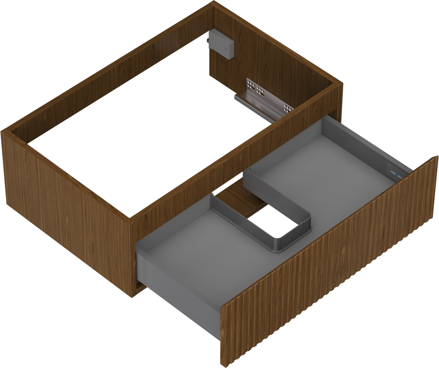Decupajul în sertar este proiectat în așa fel încât să acomodeze sifonul, care este esențial în instalațiile de lavoare. Datorită acestui fapt, mobila poate fi montată complet funcțională, fără a fi necesară renunțarea la spațiul din sertar în favoarea instalației.