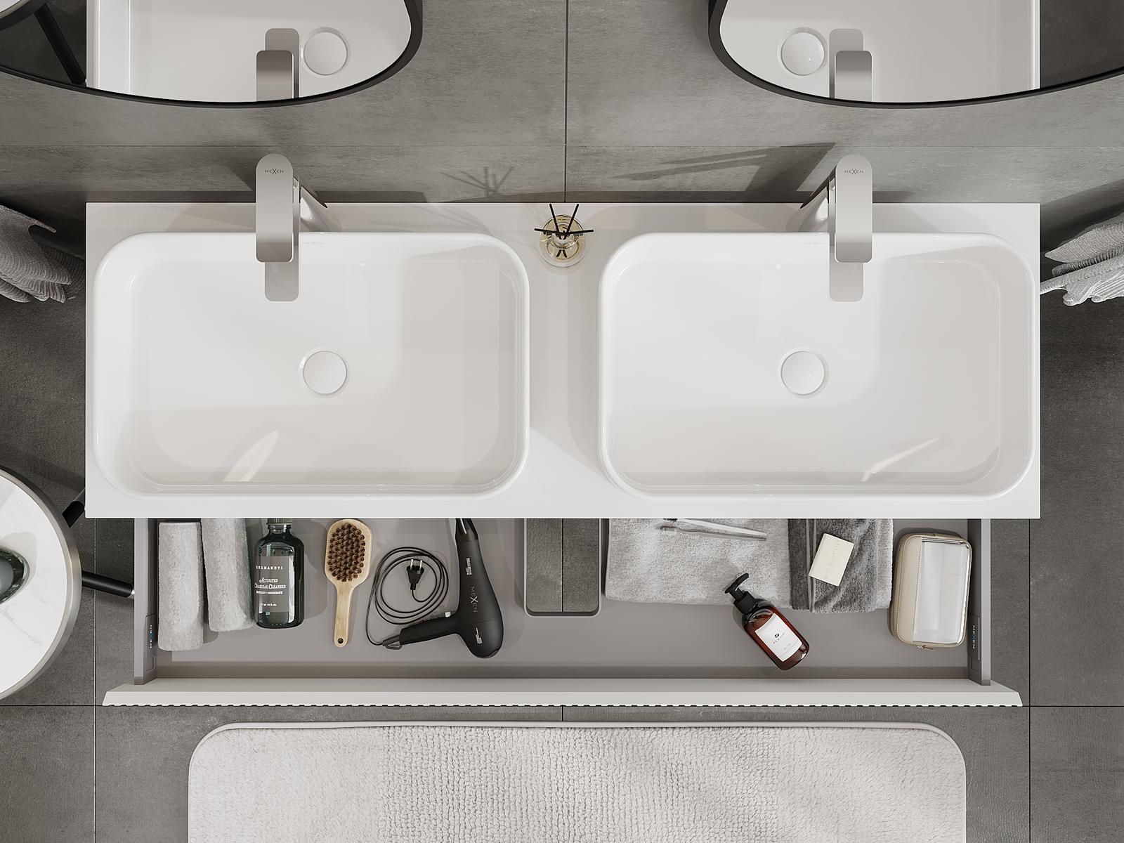 Decupajul în sertar este proiectat în așa fel încât să acomodeze sifonul, care este esențial în instalațiile de lavoare. Datorită acestui fapt, mobila poate fi montată complet funcțională, fără a fi necesară renunțarea la spațiul din sertar în favoarea instalației.