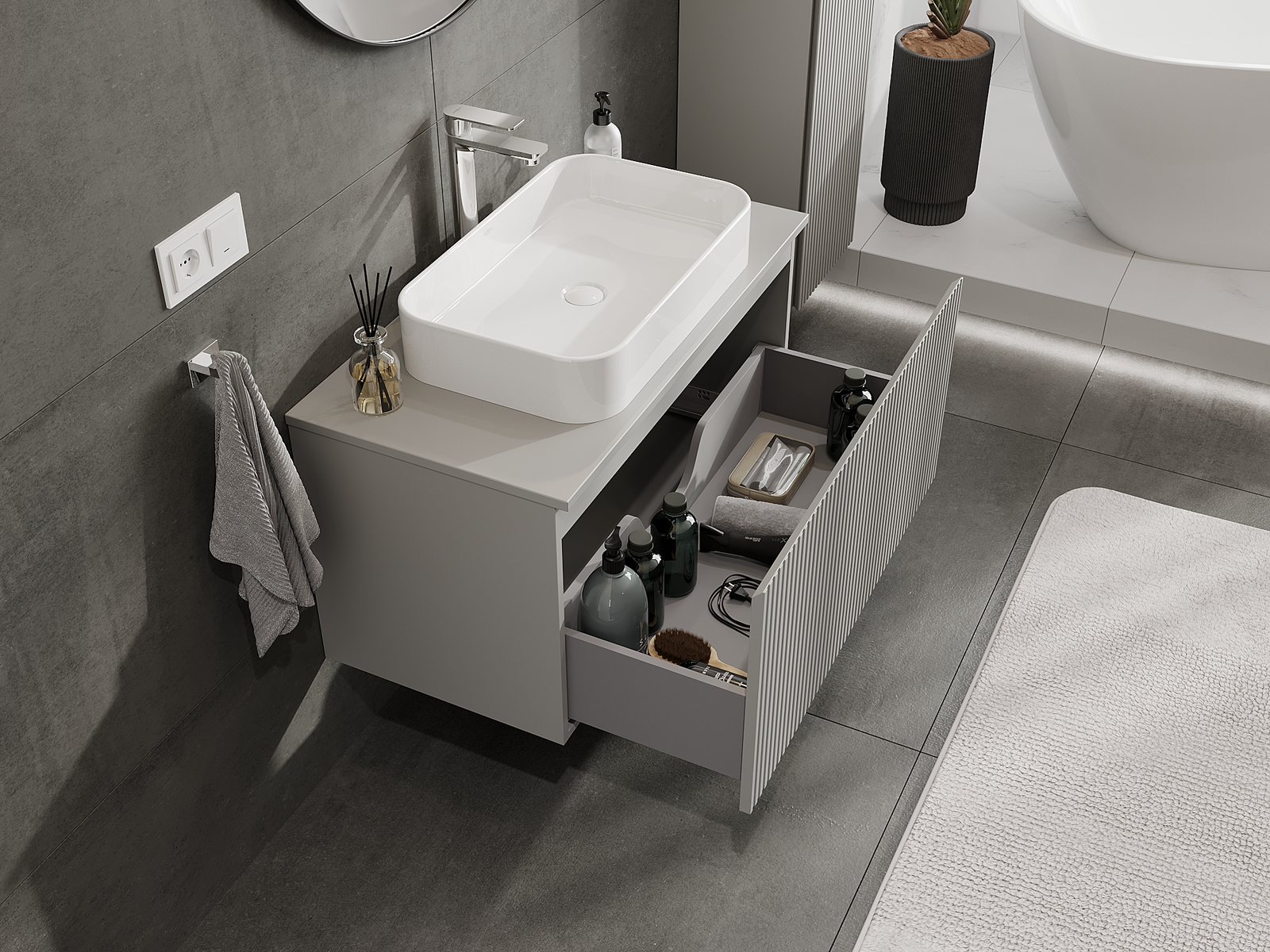 Mobilierul nostru modular pentru baie poate fi combinat în diverse configurații de culori, permițând personalizarea completă. Puteți alege atât aspectul, cât și funcțiile fiecărui element, ceea ce permite adaptarea mobilierului la preferințele dvs. stilistice și funcționale.