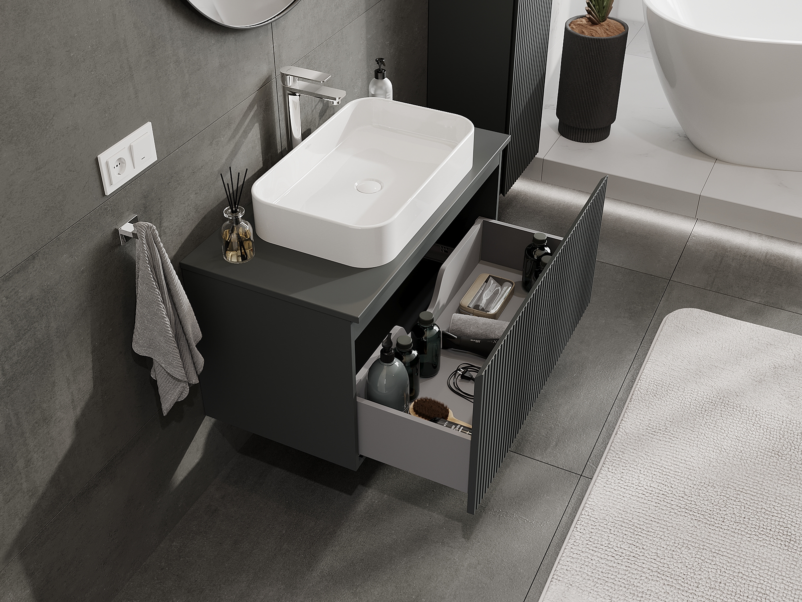 Mobilierul nostru modular pentru baie poate fi combinat în diverse configurații de culori, permițând personalizarea completă. Puteți alege atât aspectul, cât și funcțiile fiecărui element, ceea ce permite adaptarea mobilierului la preferințele dvs. stilistice și funcționale.