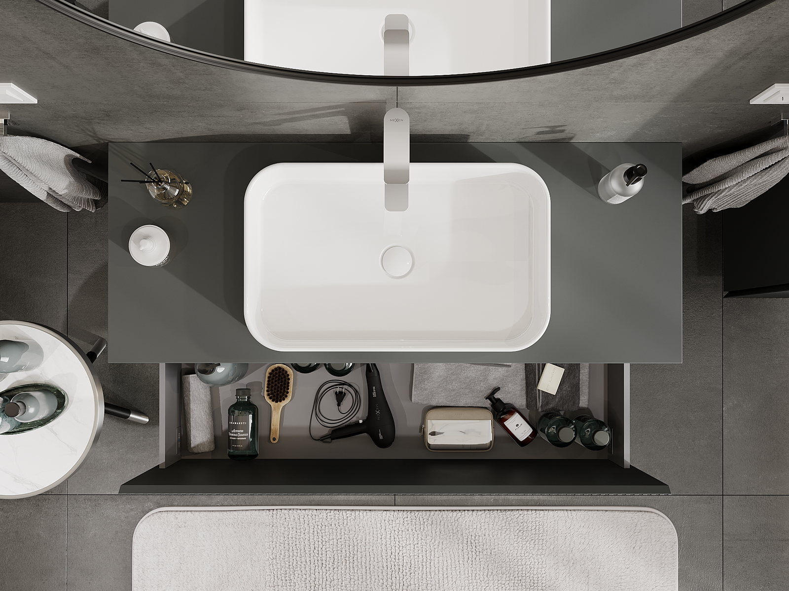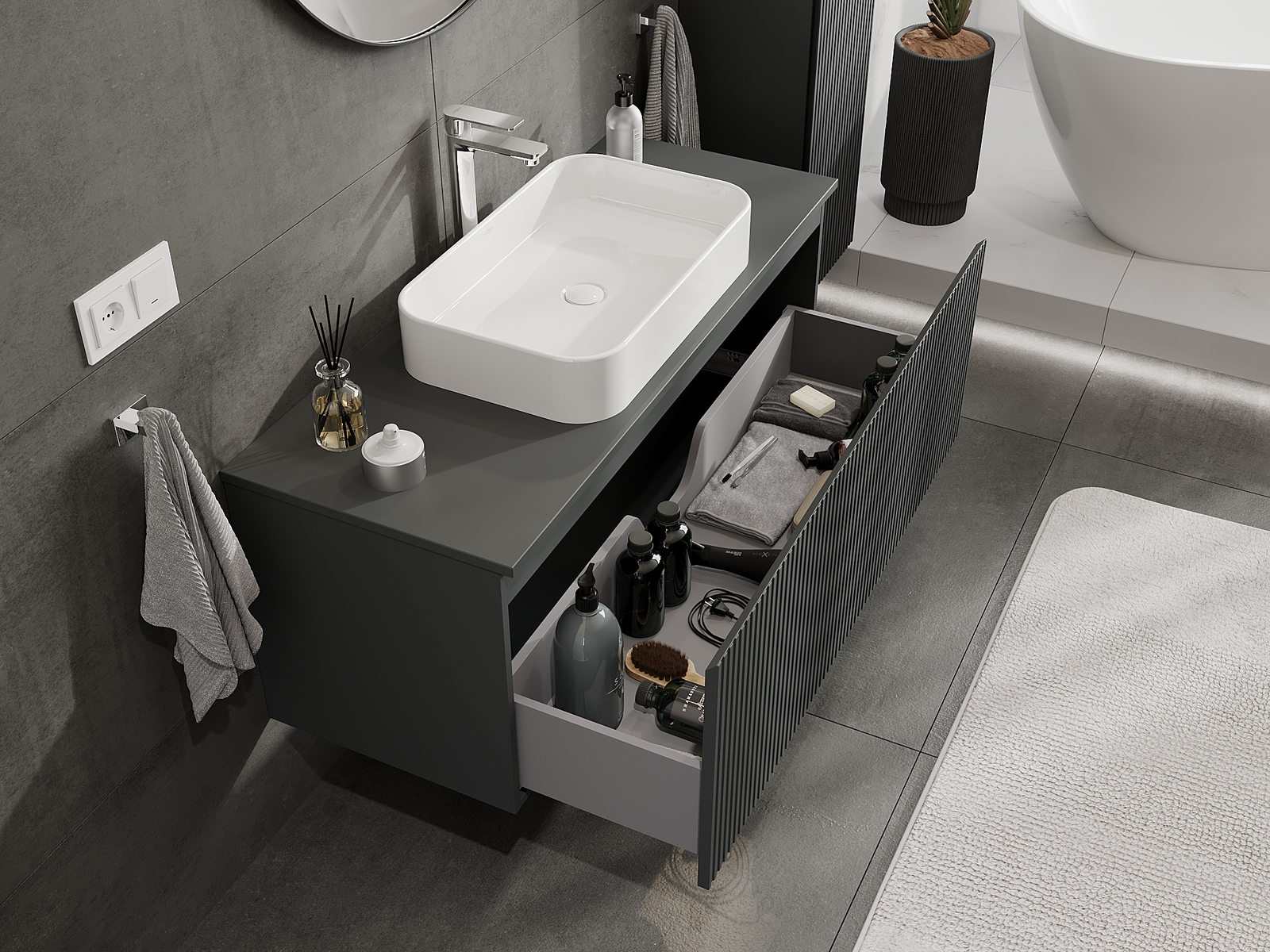 Mobilierul nostru modular pentru baie poate fi combinat în diverse configurații de culori, permițând personalizarea completă. Puteți alege atât aspectul, cât și funcțiile fiecărui element, ceea ce permite adaptarea mobilierului la preferințele dvs. stilistice și funcționale.