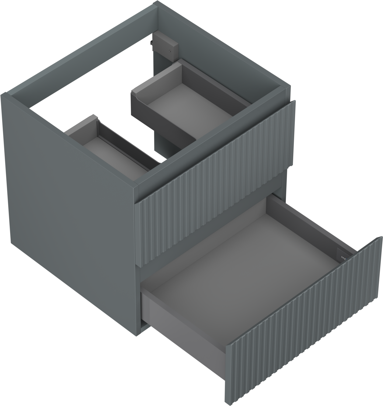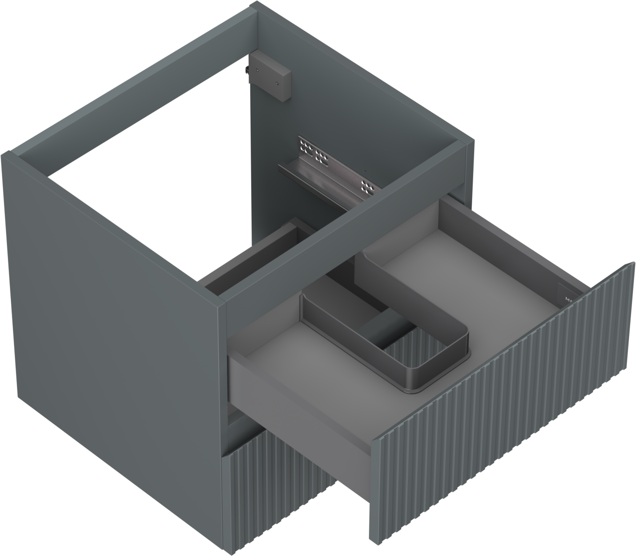 Decupajul în sertar este proiectat în așa fel încât să acomodeze sifonul, care este esențial în instalațiile de lavoare. Datorită acestui fapt, mobila poate fi montată complet funcțională, fără a fi necesară renunțarea la spațiul din sertar în favoarea instalației.