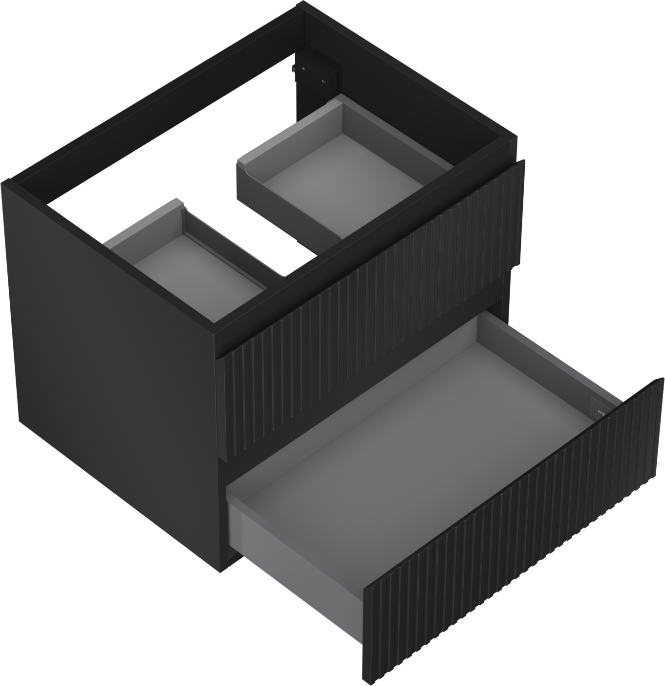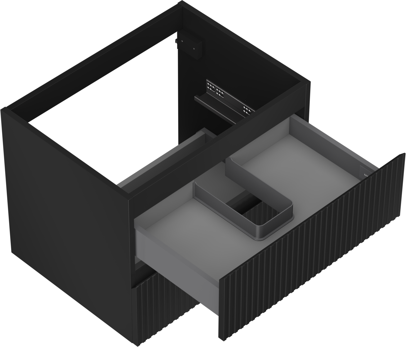 Decupajul în sertar este proiectat în așa fel încât să acomodeze sifonul, care este esențial în instalațiile de lavoare. Datorită acestui fapt, mobila poate fi montată complet funcțională, fără a fi necesară renunțarea la spațiul din sertar în favoarea instalației.