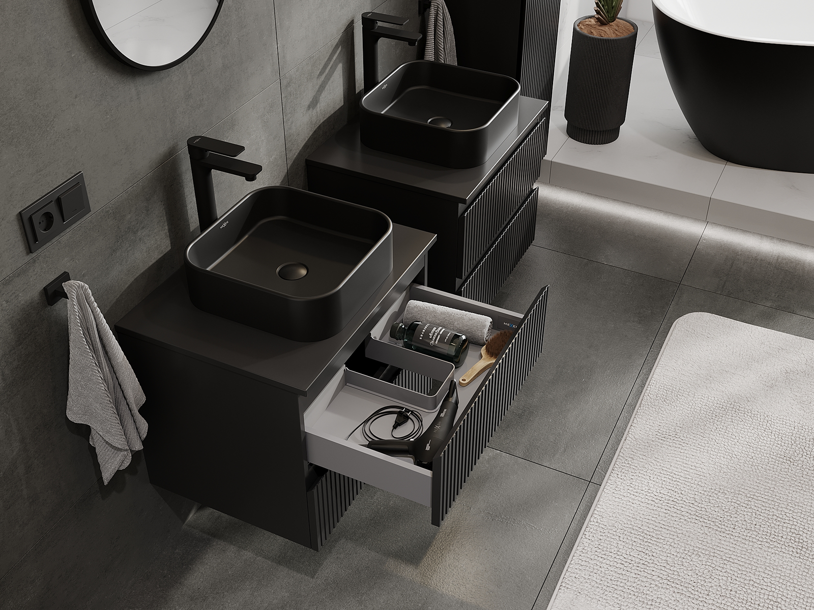Mobilierul nostru modular pentru baie poate fi combinat în diverse configurații de culori, permițând personalizarea completă. Puteți alege atât aspectul, cât și funcțiile fiecărui element, ceea ce permite adaptarea mobilierului la preferințele dvs. stilistice și funcționale.