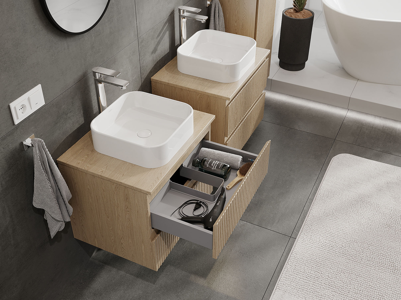 Mobilierul nostru modular pentru baie poate fi combinat în diverse configurații de culori, permițând personalizarea completă. Puteți alege atât aspectul, cât și funcțiile fiecărui element, ceea ce permite adaptarea mobilierului la preferințele dvs. stilistice și funcționale.