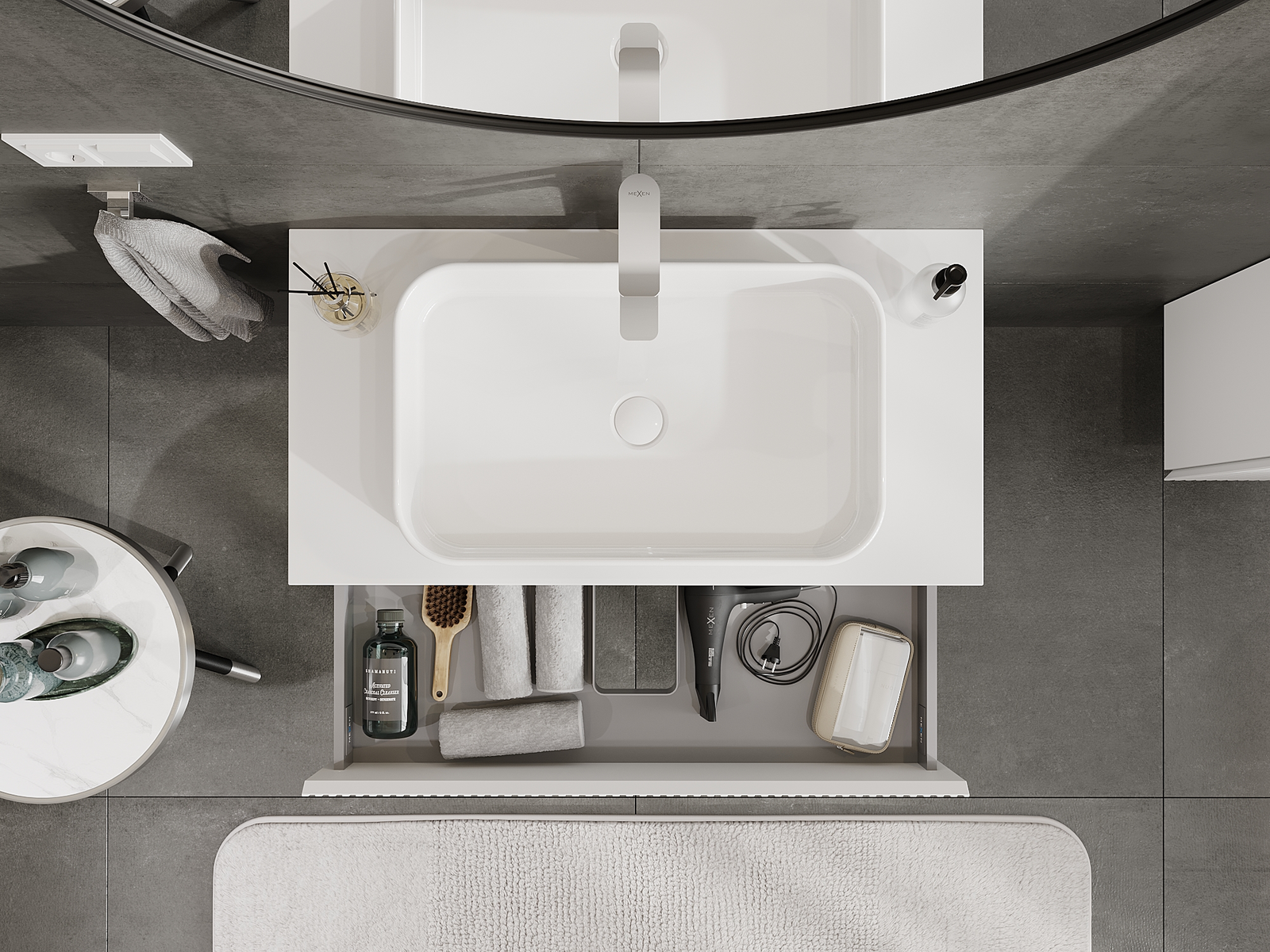 Decupajul în sertar este proiectat în așa fel încât să acomodeze sifonul, care este esențial în instalațiile de lavoare. Datorită acestui fapt, mobila poate fi montată complet funcțională, fără a fi necesară renunțarea la spațiul din sertar în favoarea instalației.