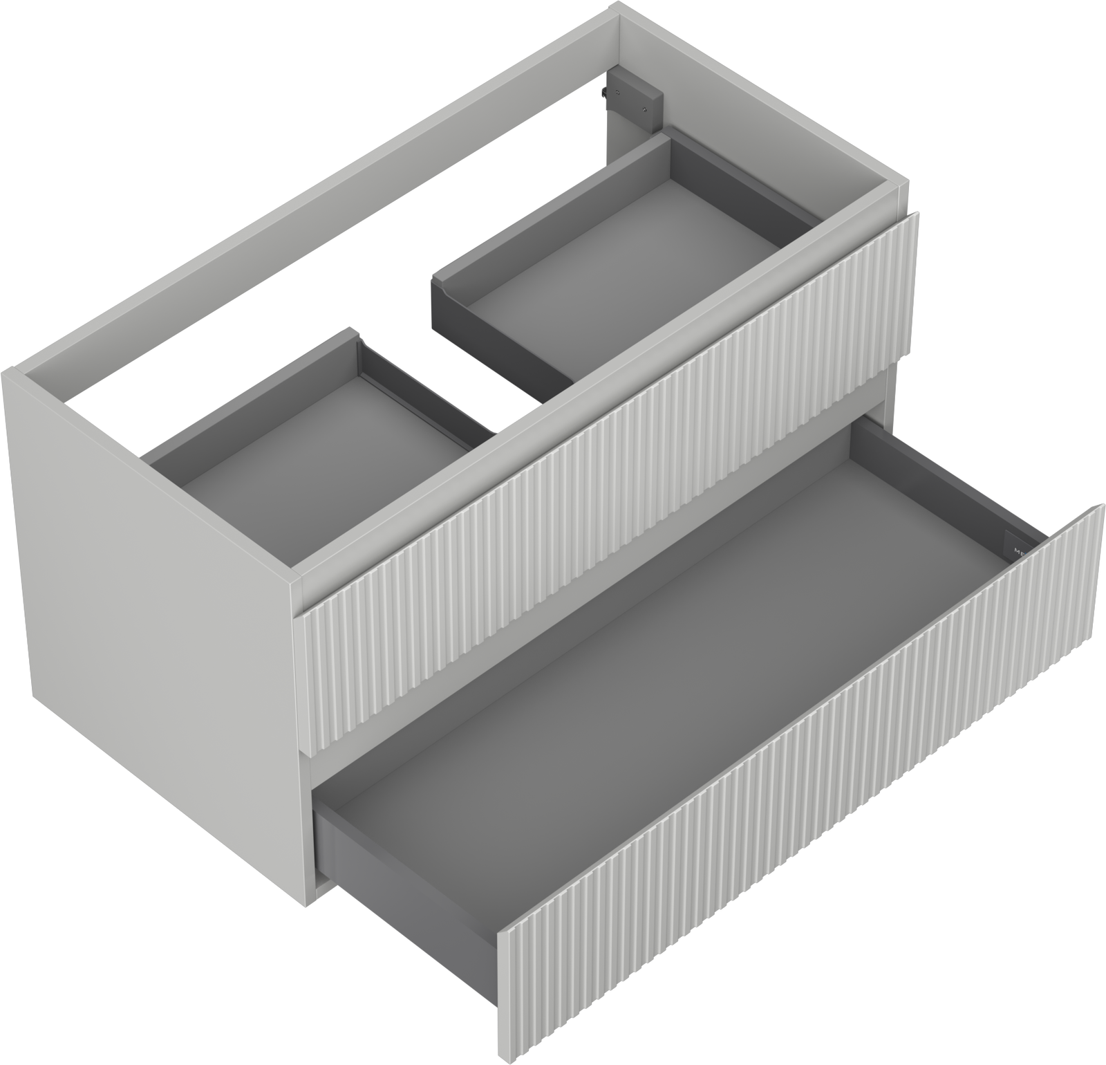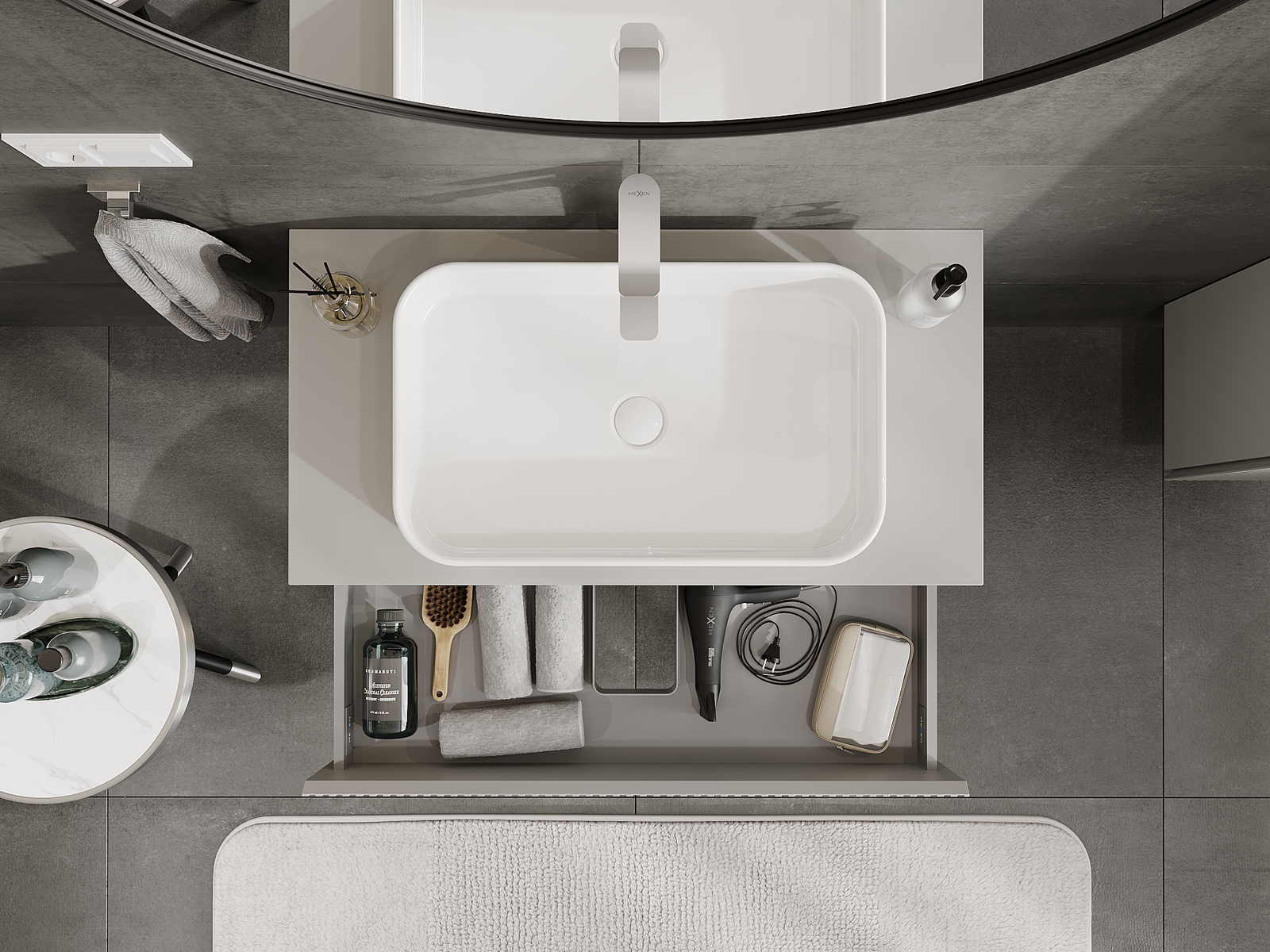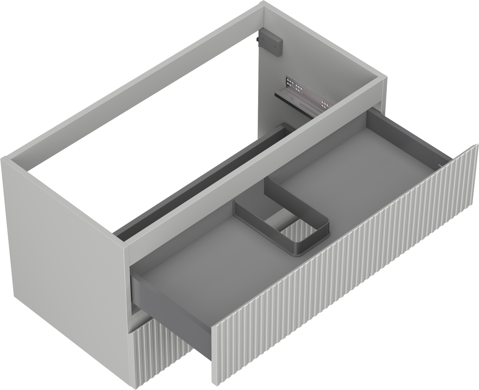 Decupajul în sertar este proiectat în așa fel încât să acomodeze sifonul, care este esențial în instalațiile de lavoare. Datorită acestui fapt, mobila poate fi montată complet funcțională, fără a fi necesară renunțarea la spațiul din sertar în favoarea instalației.