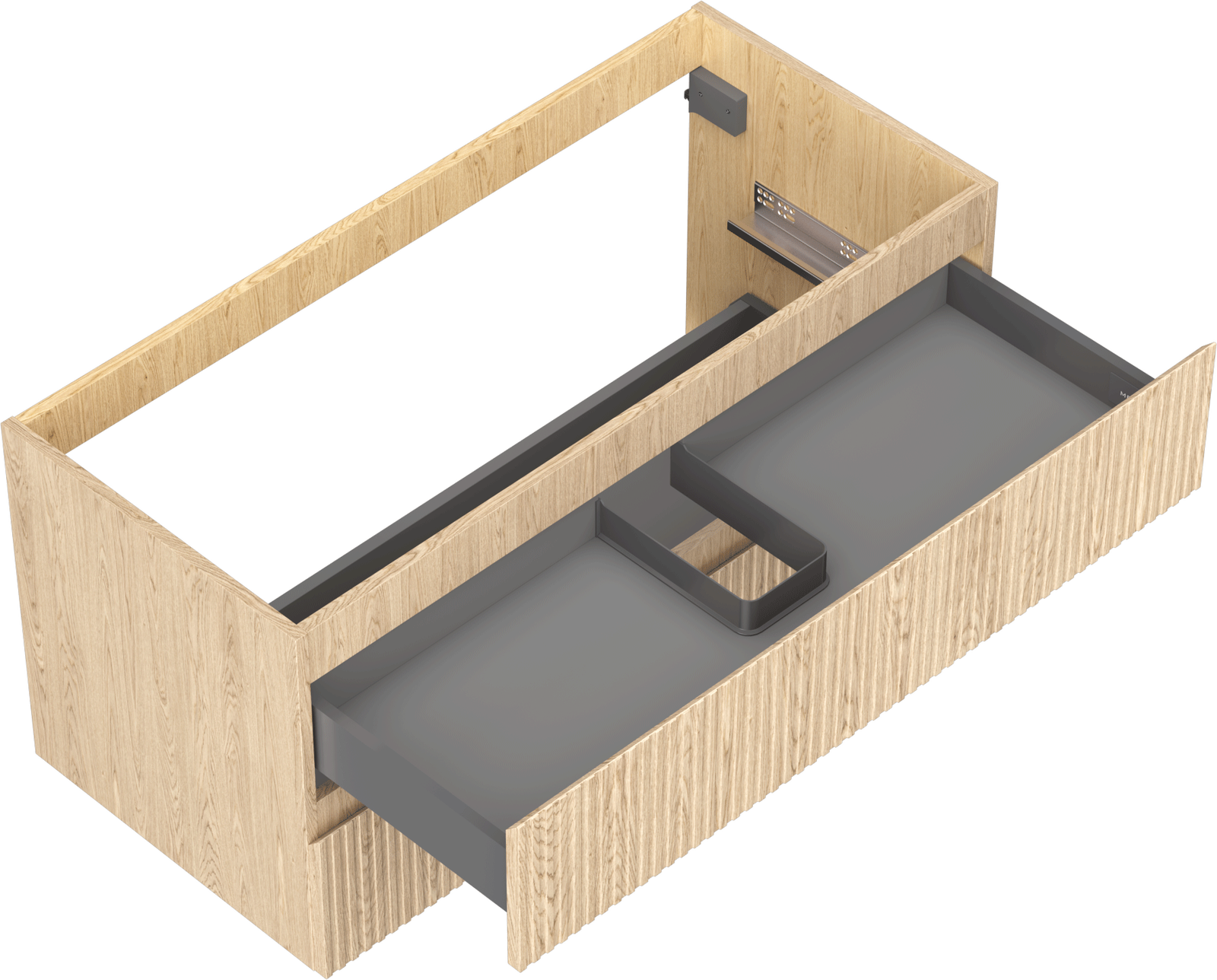 Decupajul în sertar este proiectat în așa fel încât să acomodeze sifonul, care este esențial în instalațiile de lavoare. Datorită acestui fapt, mobila poate fi montată complet funcțională, fără a fi necesară renunțarea la spațiul din sertar în favoarea instalației.