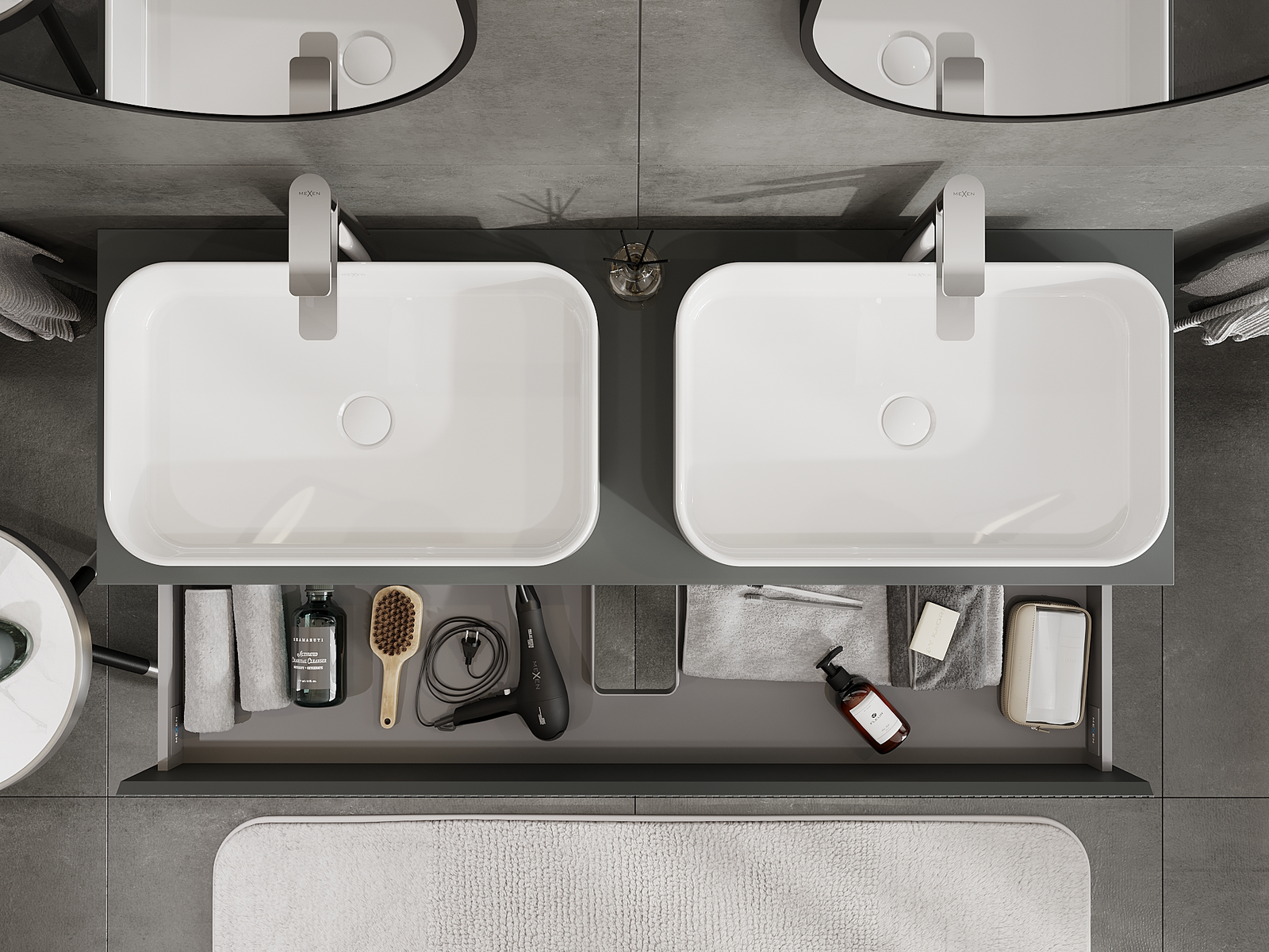 Mobilierul nostru modular pentru baie poate fi combinat în diverse configurații de culori, permițând personalizarea completă. Puteți alege atât aspectul, cât și funcțiile fiecărui element, ceea ce permite adaptarea mobilierului la preferințele dvs. stilistice și funcționale.