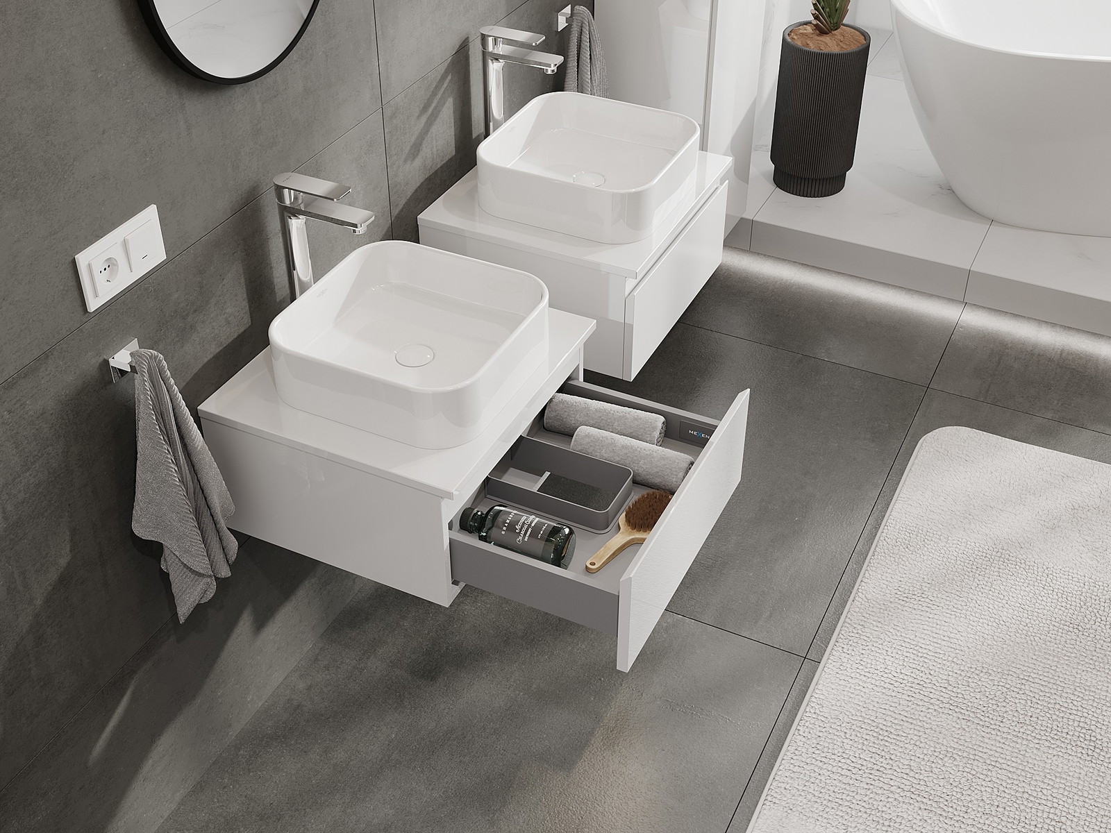 Mobilierul nostru modular pentru baie poate fi combinat în diverse configurații de culori, permițând personalizarea completă. Puteți alege atât aspectul, cât și funcțiile fiecărui element, ceea ce permite adaptarea mobilierului la preferințele dvs. stilistice și funcționale.