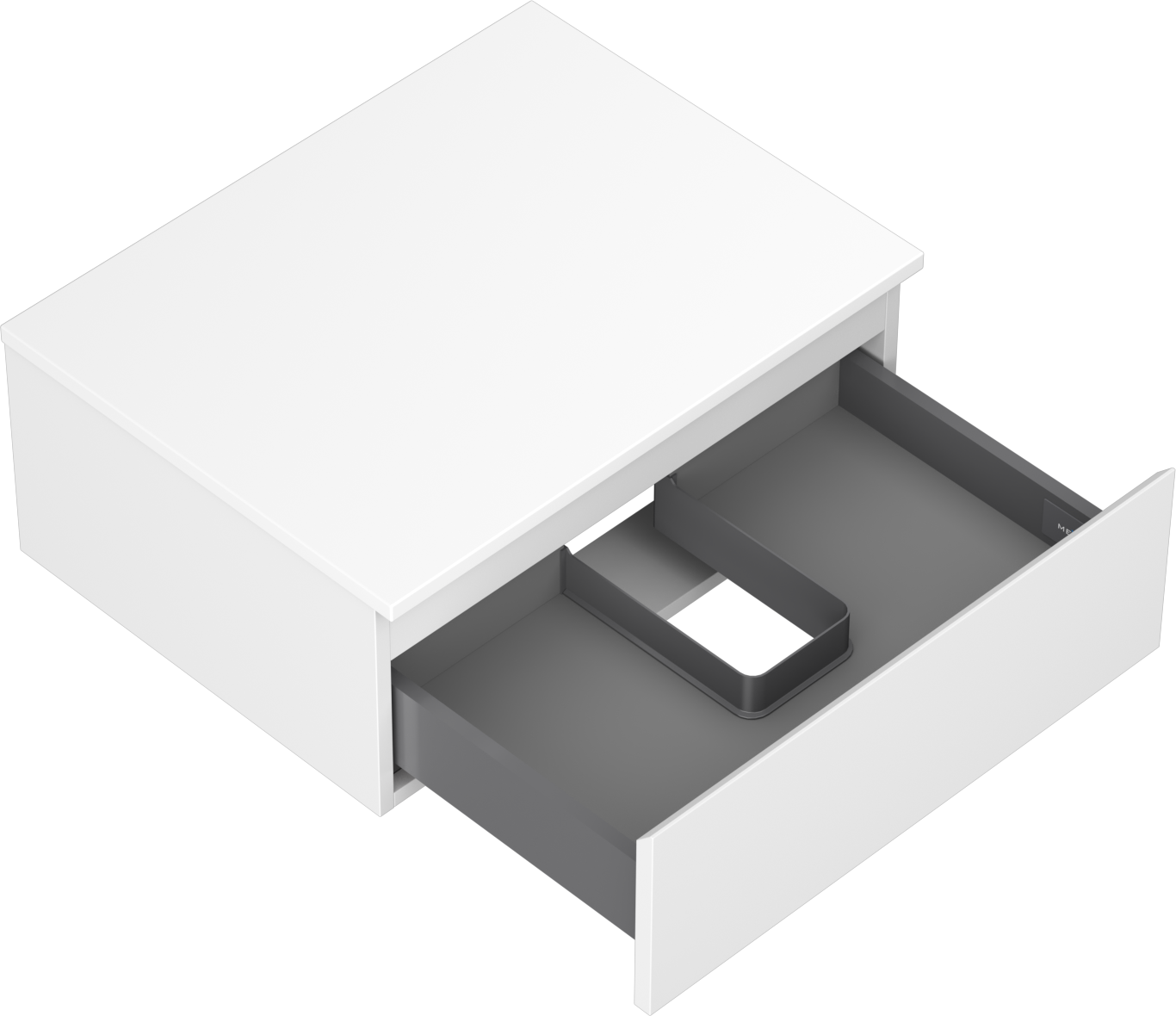 Decupajul în sertar este proiectat în așa fel încât să acomodeze sifonul, care este esențial în instalațiile de lavoare. Datorită acestui fapt, mobila poate fi montată complet funcțională, fără a fi necesară renunțarea la spațiul din sertar în favoarea instalației.