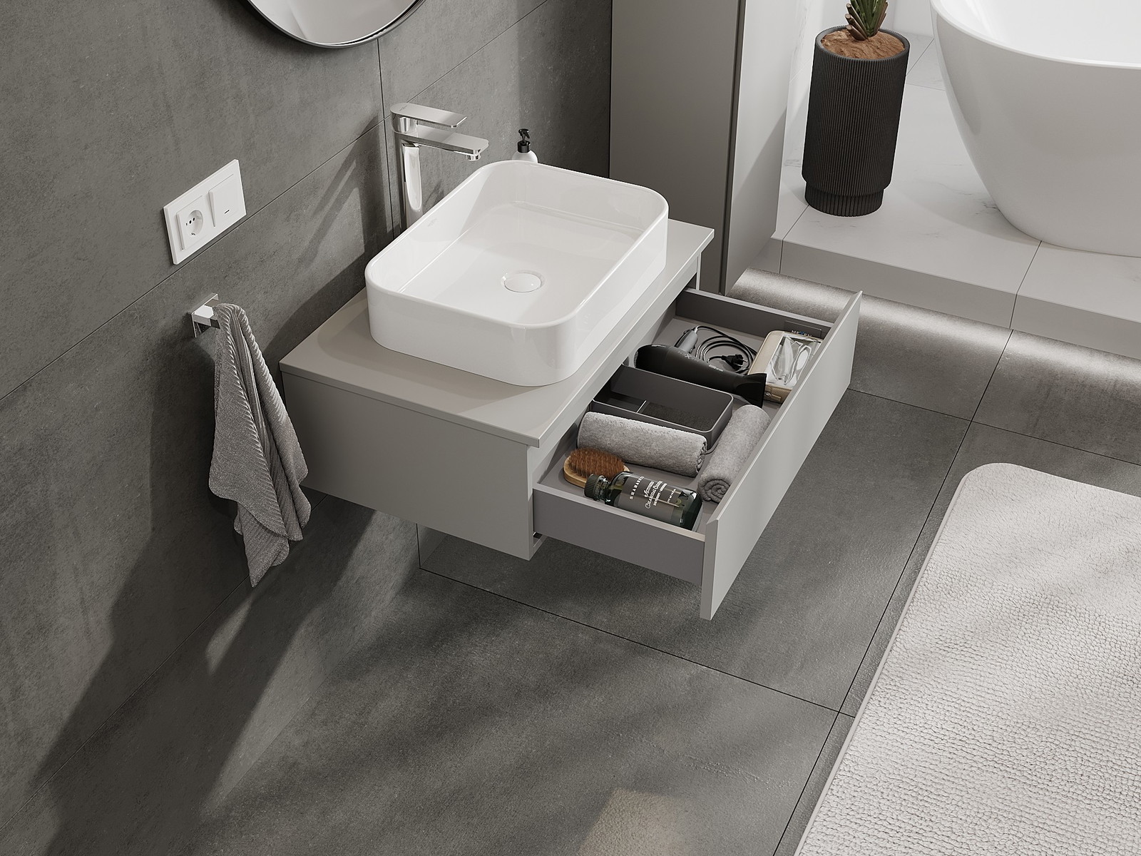 Mobilierul nostru modular pentru baie poate fi combinat în diverse configurații de culori, permițând personalizarea completă. Puteți alege atât aspectul, cât și funcțiile fiecărui element, ceea ce permite adaptarea mobilierului la preferințele dvs. stilistice și funcționale.
