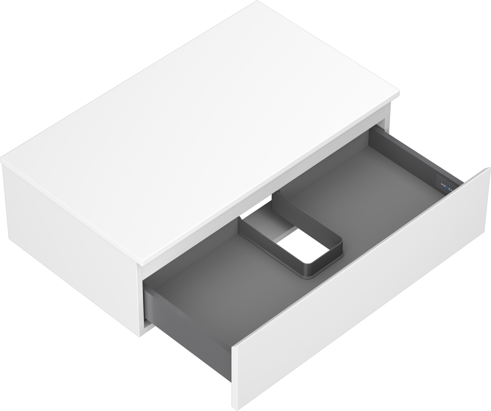 Decupajul în sertar este proiectat în așa fel încât să acomodeze sifonul, care este esențial în instalațiile de lavoare. Datorită acestui fapt, mobila poate fi montată complet funcțională, fără a fi necesară renunțarea la spațiul din sertar în favoarea instalației.