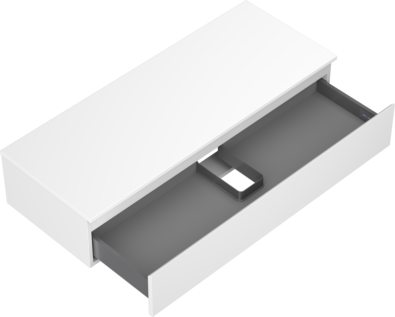 Decupajul în sertar este proiectat în așa fel încât să acomodeze sifonul, care este esențial în instalațiile de lavoare. Datorită acestui fapt, mobila poate fi montată complet funcțională, fără a fi necesară renunțarea la spațiul din sertar în favoarea instalației.
