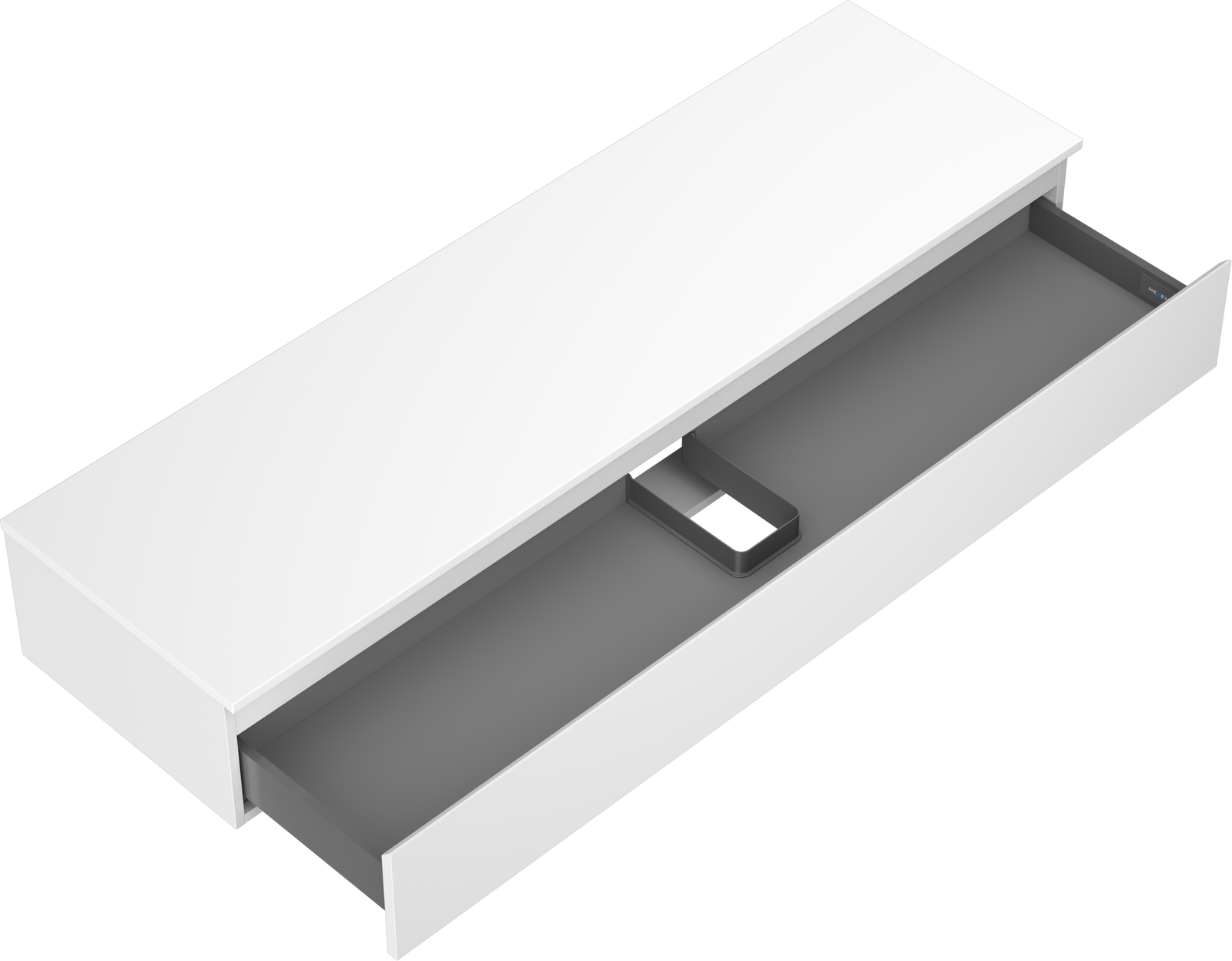 Decupajul în sertar este proiectat în așa fel încât să acomodeze sifonul, care este esențial în instalațiile de lavoare. Datorită acestui fapt, mobila poate fi montată complet funcțională, fără a fi necesară renunțarea la spațiul din sertar în favoarea instalației.