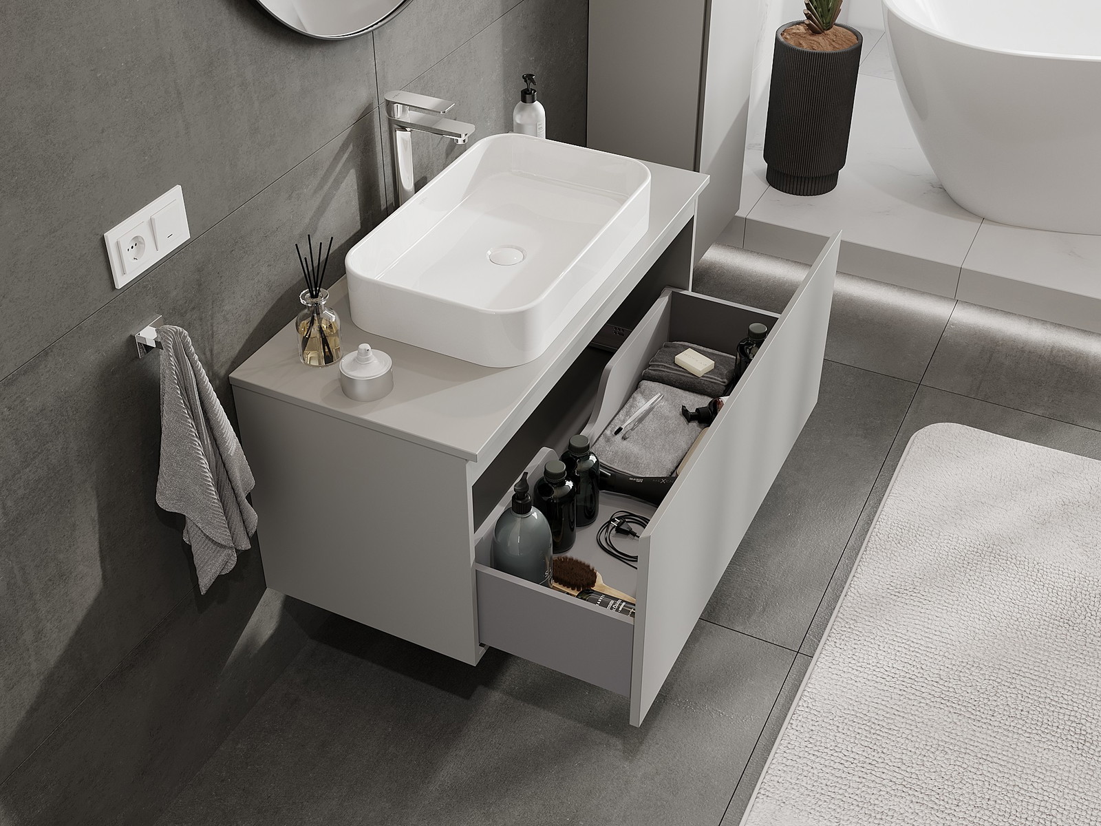 Mobilierul nostru modular pentru baie poate fi combinat în diverse configurații de culori, permițând personalizarea completă. Puteți alege atât aspectul, cât și funcțiile fiecărui element, ceea ce permite adaptarea mobilierului la preferințele dvs. stilistice și funcționale.