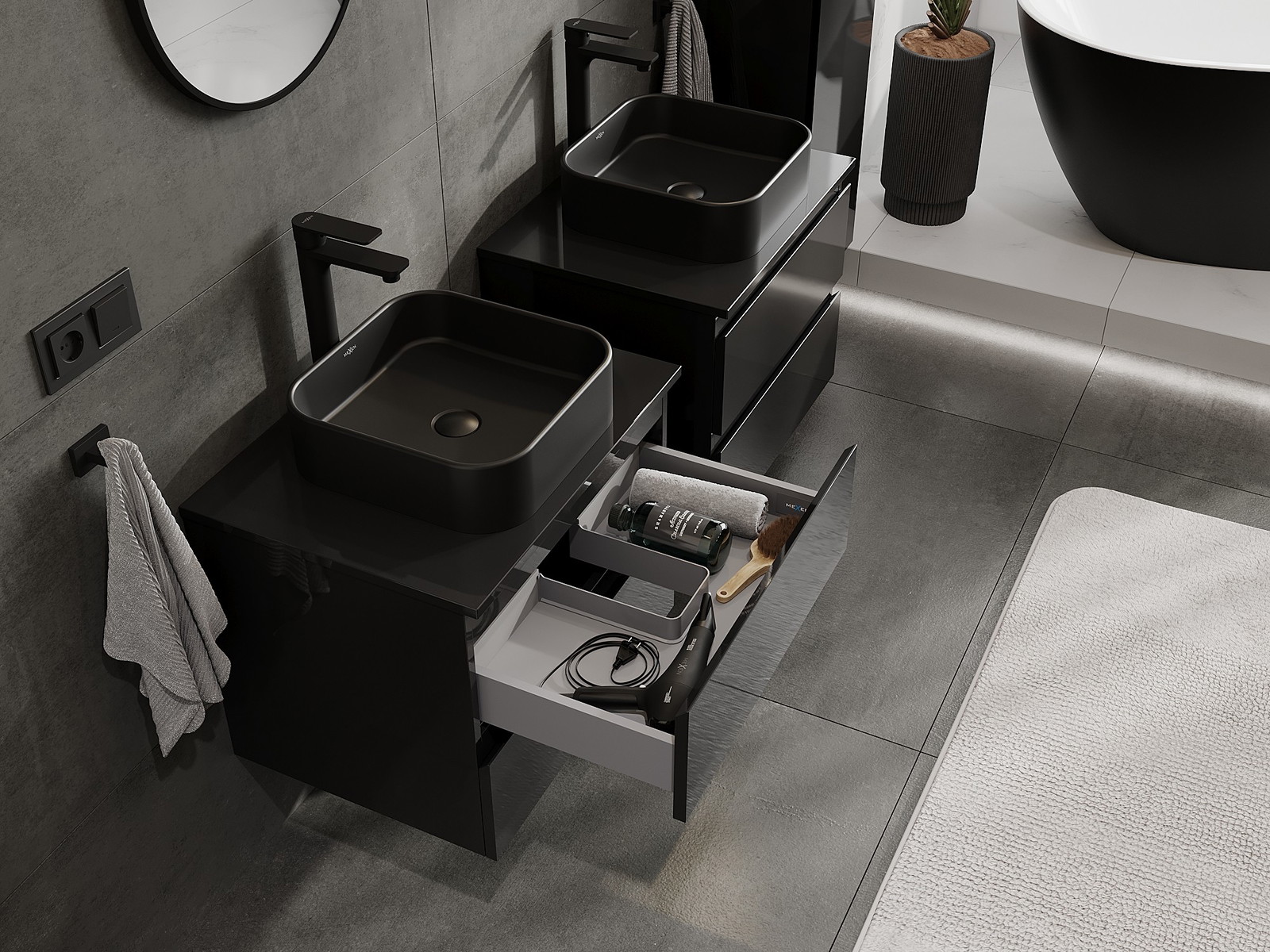 Mobilierul nostru modular pentru baie poate fi combinat în diverse configurații de culori, permițând personalizarea completă. Puteți alege atât aspectul, cât și funcțiile fiecărui element, ceea ce permite adaptarea mobilierului la preferințele dvs. stilistice și funcționale.