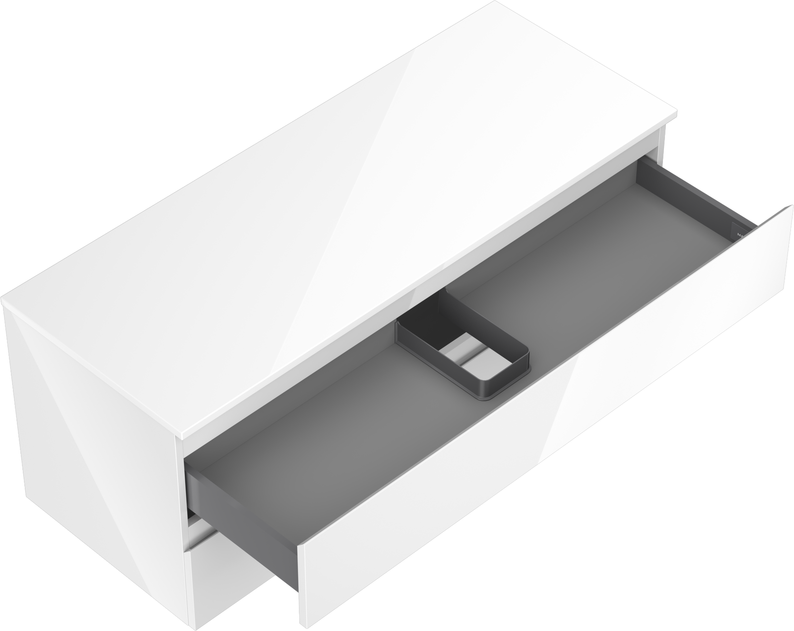 Decupajul în sertar este proiectat în așa fel încât să acomodeze sifonul, care este esențial în instalațiile de lavoare. Datorită acestui fapt, mobila poate fi montată complet funcțională, fără a fi necesară renunțarea la spațiul din sertar în favoarea instalației.