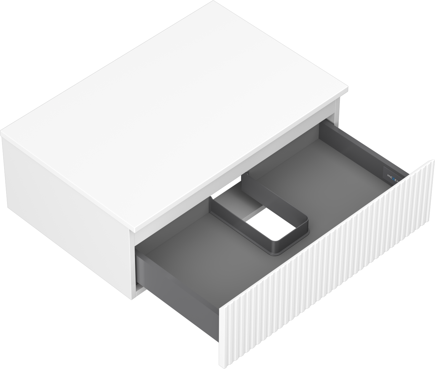 Decupajul în sertar este proiectat în așa fel încât să acomodeze sifonul, care este esențial în instalațiile de lavoare. Datorită acestui fapt, mobila poate fi montată complet funcțională, fără a fi necesară renunțarea la spațiul din sertar în favoarea instalației.