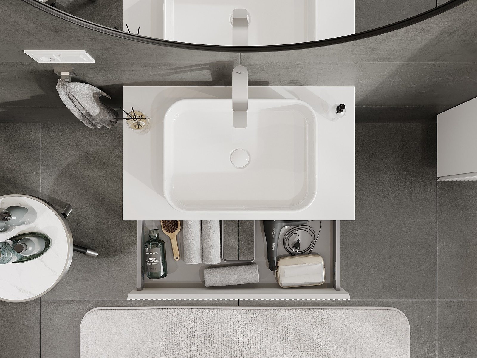 Decupajul în sertar este proiectat în așa fel încât să acomodeze sifonul, care este esențial în instalațiile de lavoare. Datorită acestui fapt, mobila poate fi montată complet funcțională, fără a fi necesară renunțarea la spațiul din sertar în favoarea instalației.