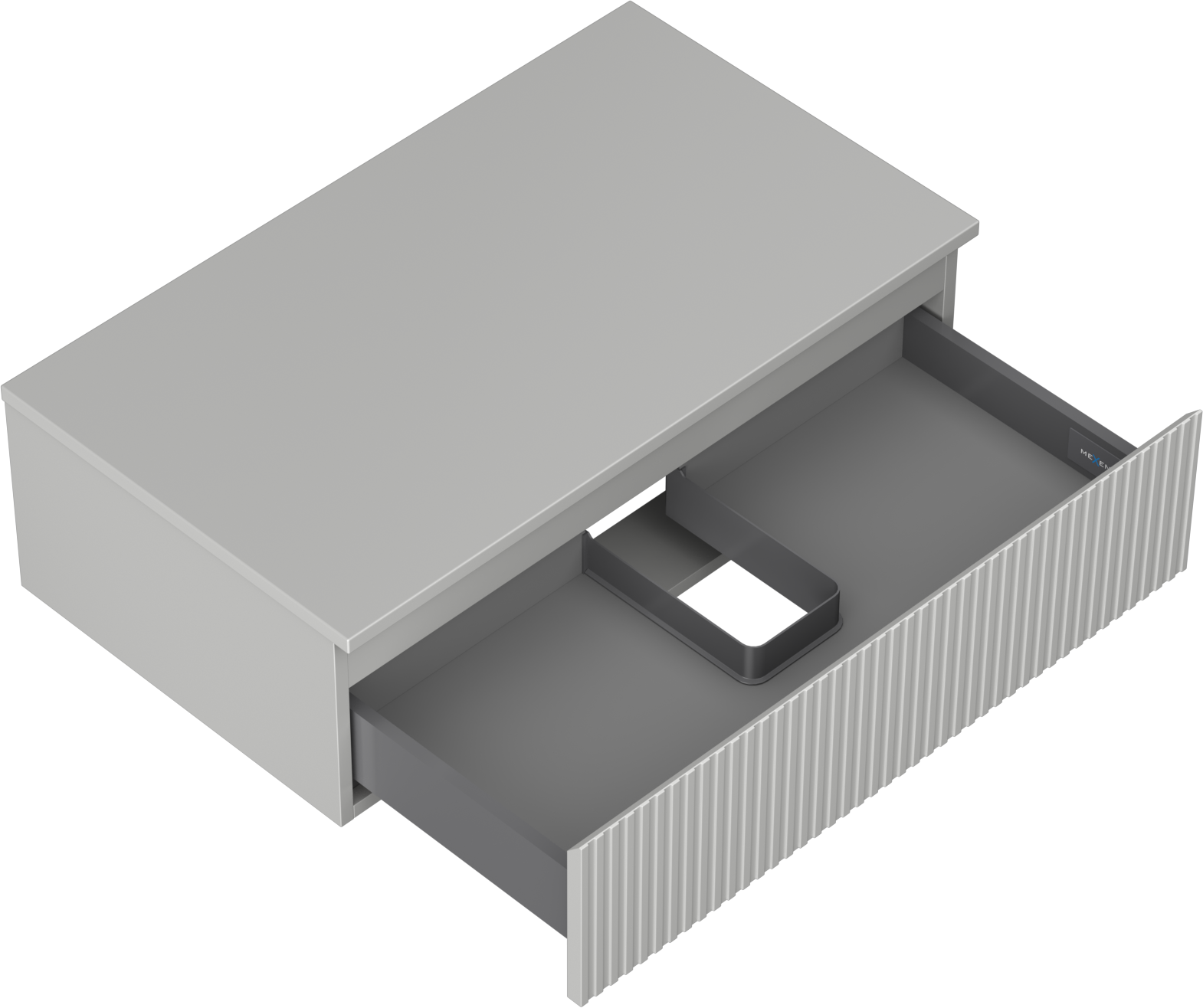 Decupajul în sertar este proiectat în așa fel încât să acomodeze sifonul, care este esențial în instalațiile de lavoare. Datorită acestui fapt, mobila poate fi montată complet funcțională, fără a fi necesară renunțarea la spațiul din sertar în favoarea instalației.