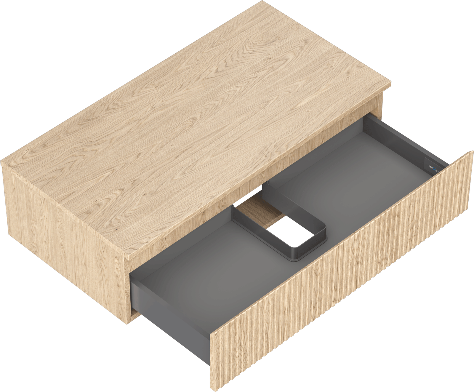 Decupajul în sertar este proiectat în așa fel încât să acomodeze sifonul, care este esențial în instalațiile de lavoare. Datorită acestui fapt, mobila poate fi montată complet funcțională, fără a fi necesară renunțarea la spațiul din sertar în favoarea instalației.