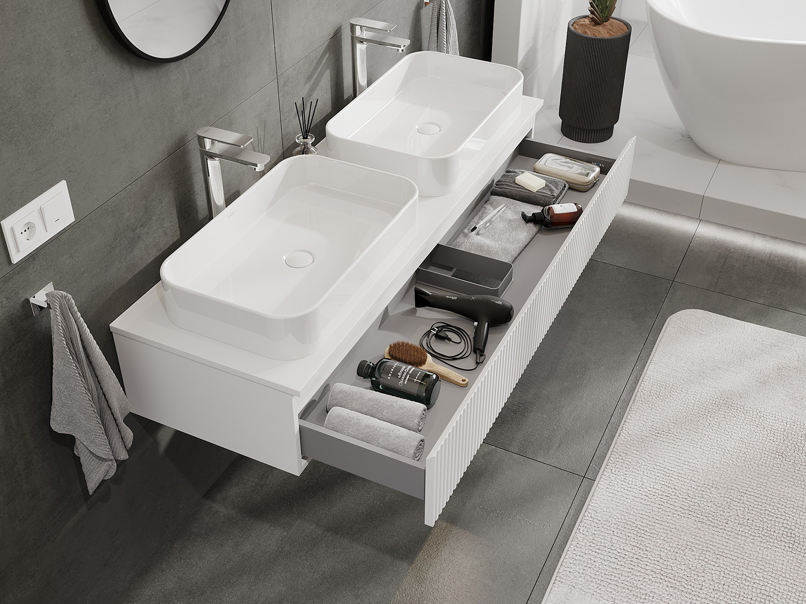 Mobilierul nostru modular pentru baie poate fi combinat în diverse configurații de culori, permițând personalizarea completă. Puteți alege atât aspectul, cât și funcțiile fiecărui element, ceea ce permite adaptarea mobilierului la preferințele dvs. stilistice și funcționale.