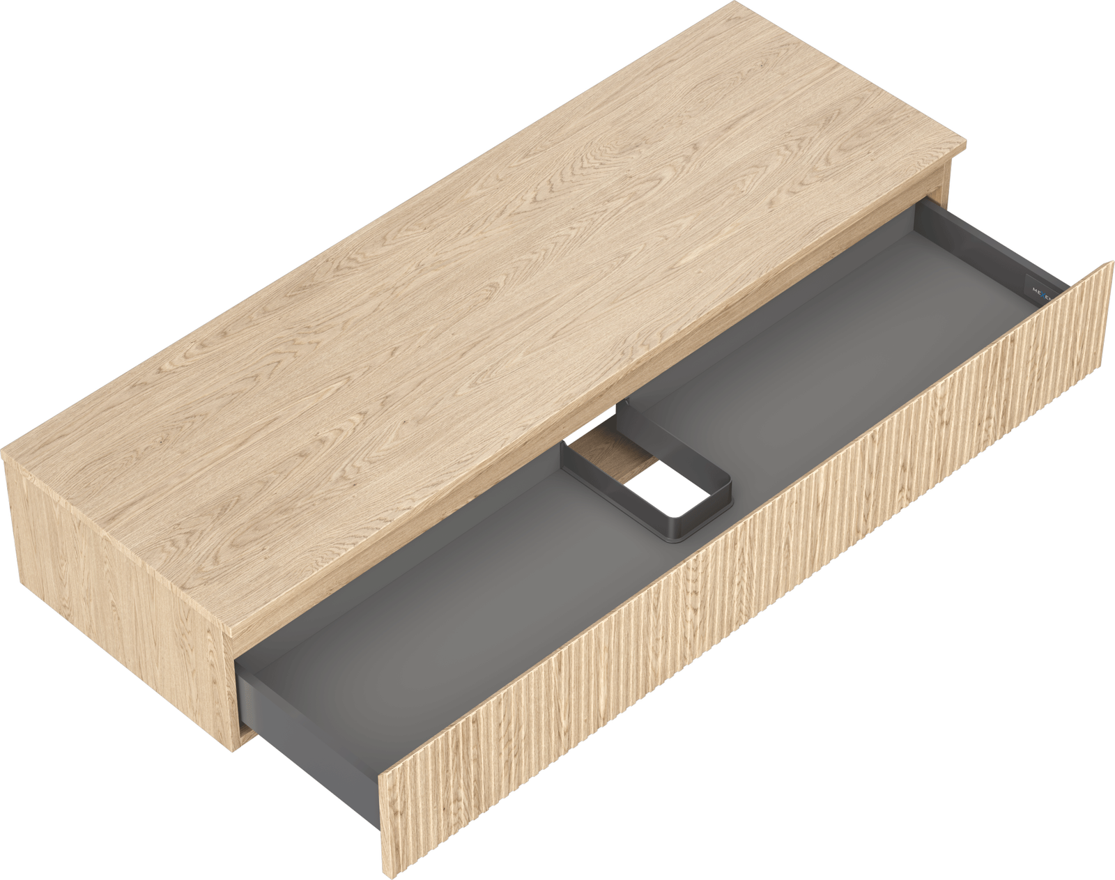 Decupajul în sertar este proiectat în așa fel încât să acomodeze sifonul, care este esențial în instalațiile de lavoare. Datorită acestui fapt, mobila poate fi montată complet funcțională, fără a fi necesară renunțarea la spațiul din sertar în favoarea instalației.