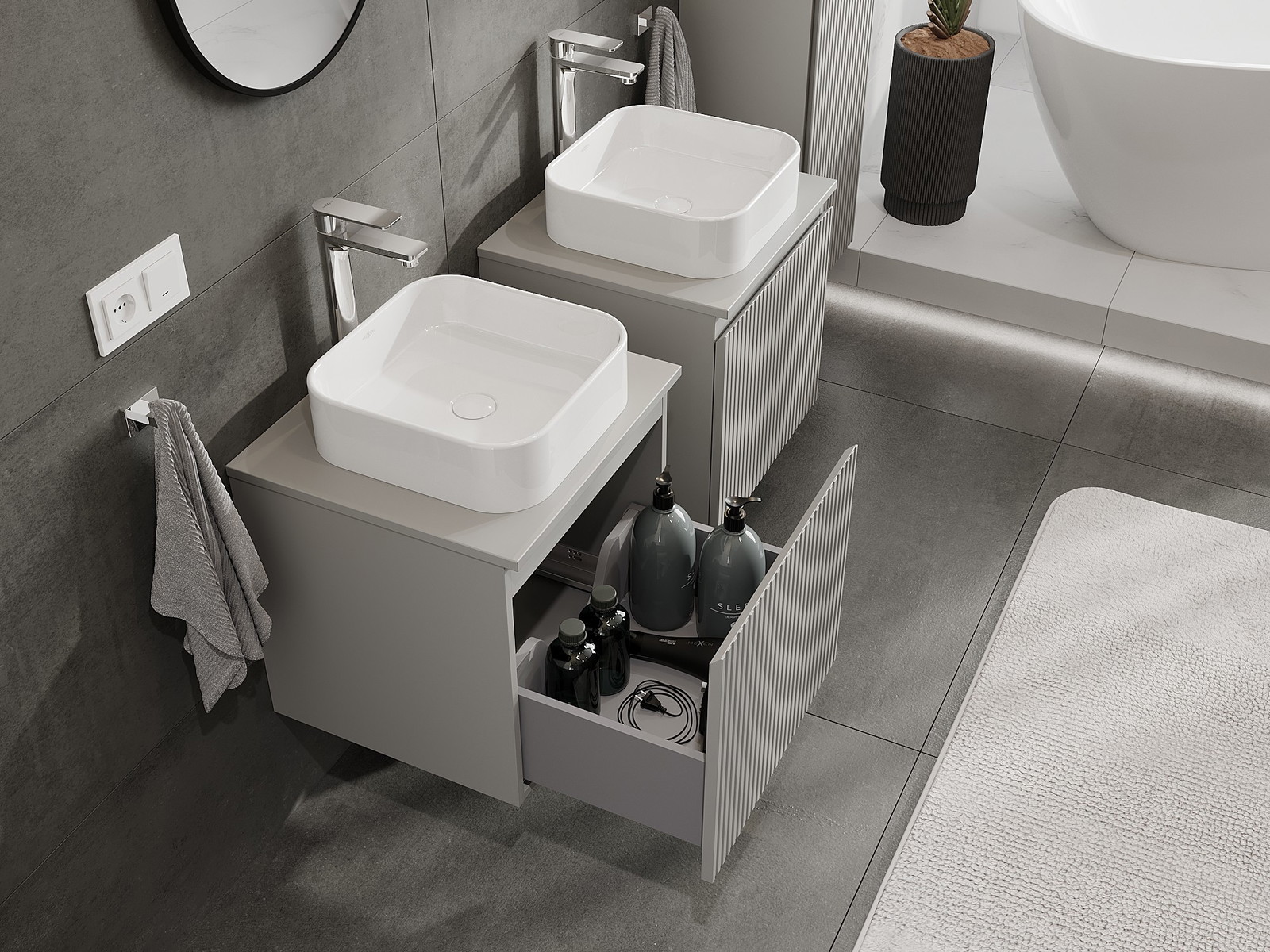 Mobilierul nostru modular pentru baie poate fi combinat în diverse configurații de culori, permițând personalizarea completă. Puteți alege atât aspectul, cât și funcțiile fiecărui element, ceea ce permite adaptarea mobilierului la preferințele dvs. stilistice și funcționale.