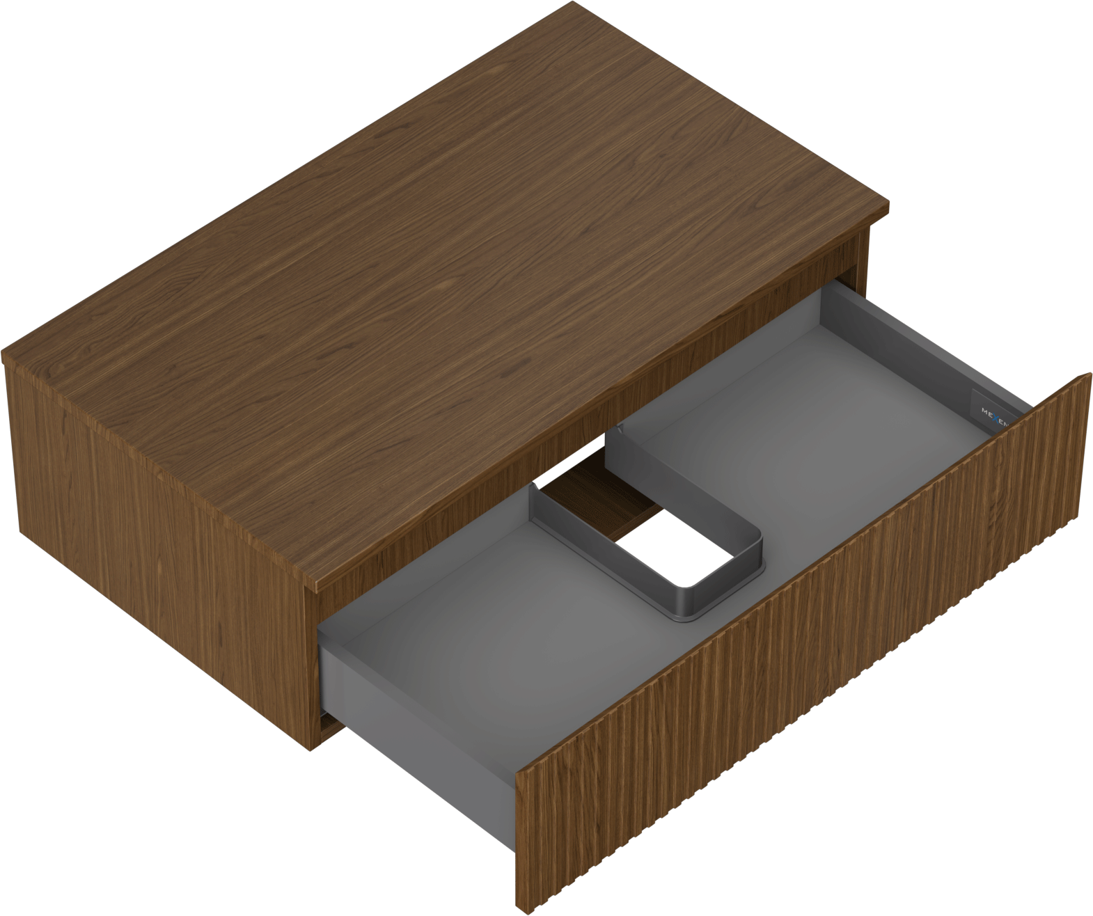 Decupajul în sertar este proiectat în așa fel încât să acomodeze sifonul, care este esențial în instalațiile de lavoare. Datorită acestui fapt, mobila poate fi montată complet funcțională, fără a fi necesară renunțarea la spațiul din sertar în favoarea instalației.