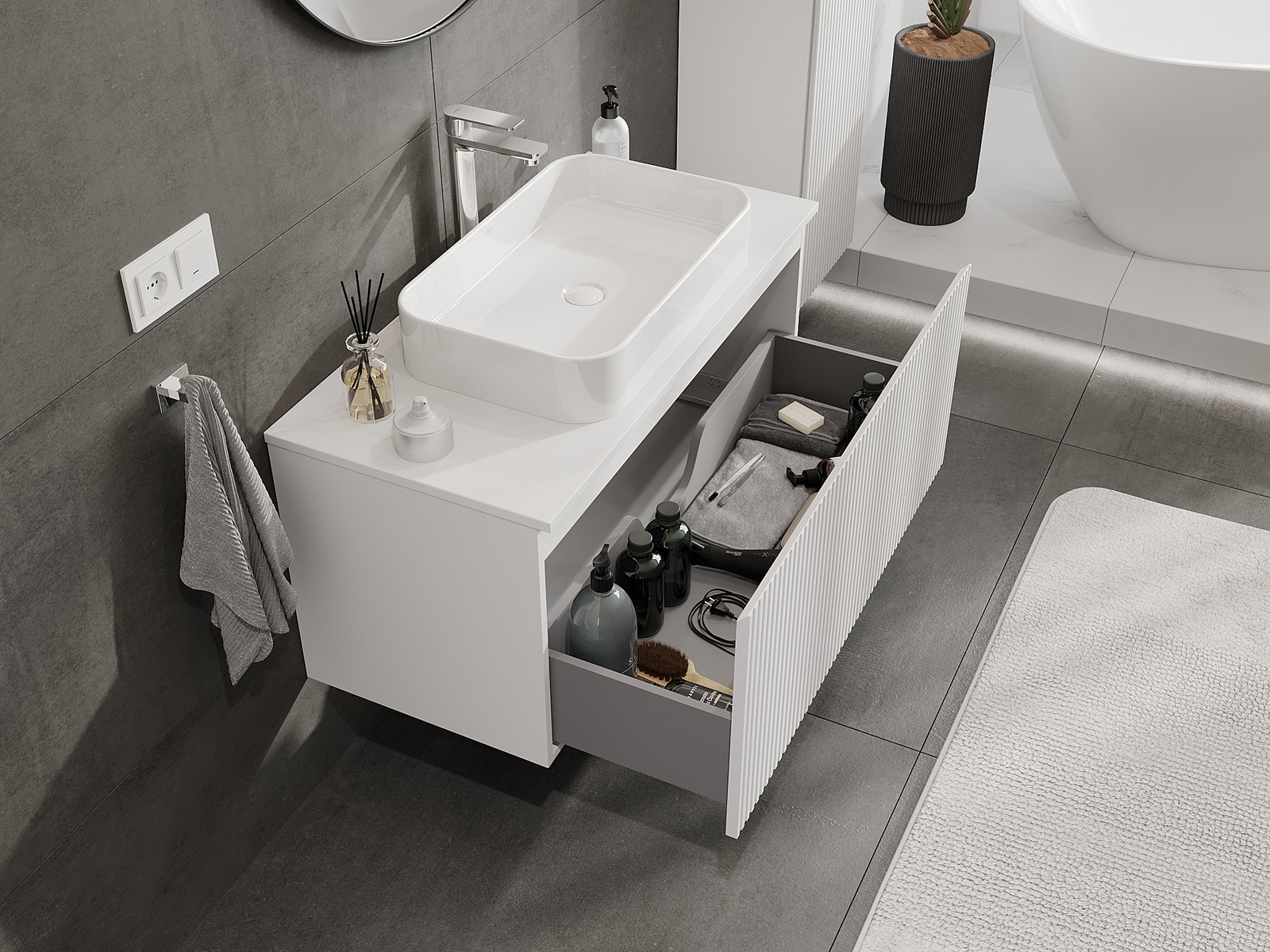 Mobilierul nostru modular pentru baie poate fi combinat în diverse configurații de culori, permițând personalizarea completă. Puteți alege atât aspectul, cât și funcțiile fiecărui element, ceea ce permite adaptarea mobilierului la preferințele dvs. stilistice și funcționale.