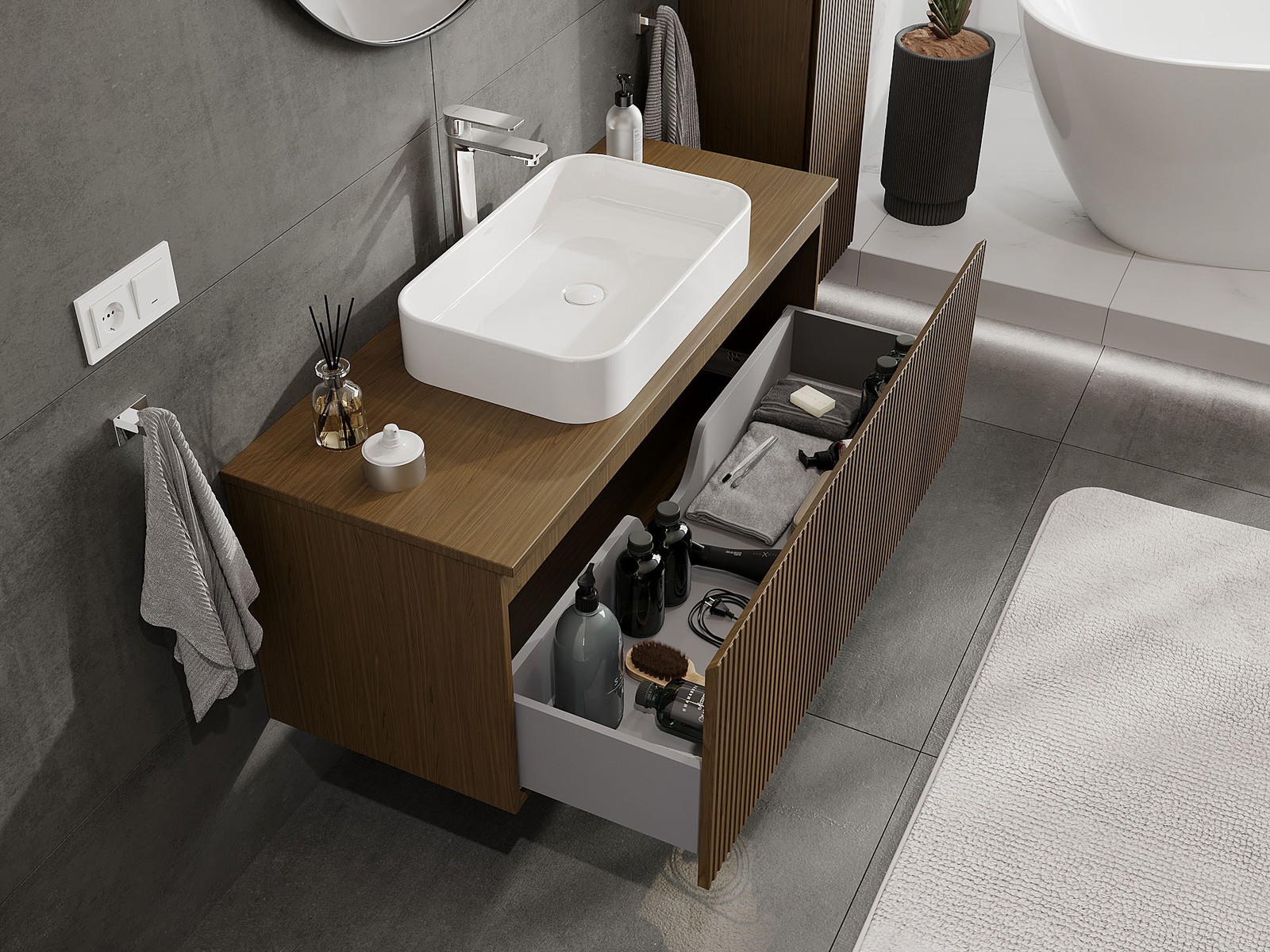 Mobilierul nostru modular pentru baie poate fi combinat în diverse configurații de culori, permițând personalizarea completă. Puteți alege atât aspectul, cât și funcțiile fiecărui element, ceea ce permite adaptarea mobilierului la preferințele dvs. stilistice și funcționale.