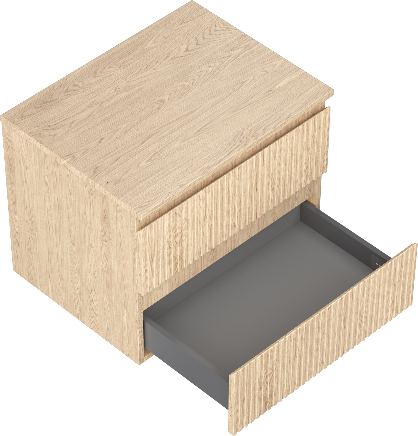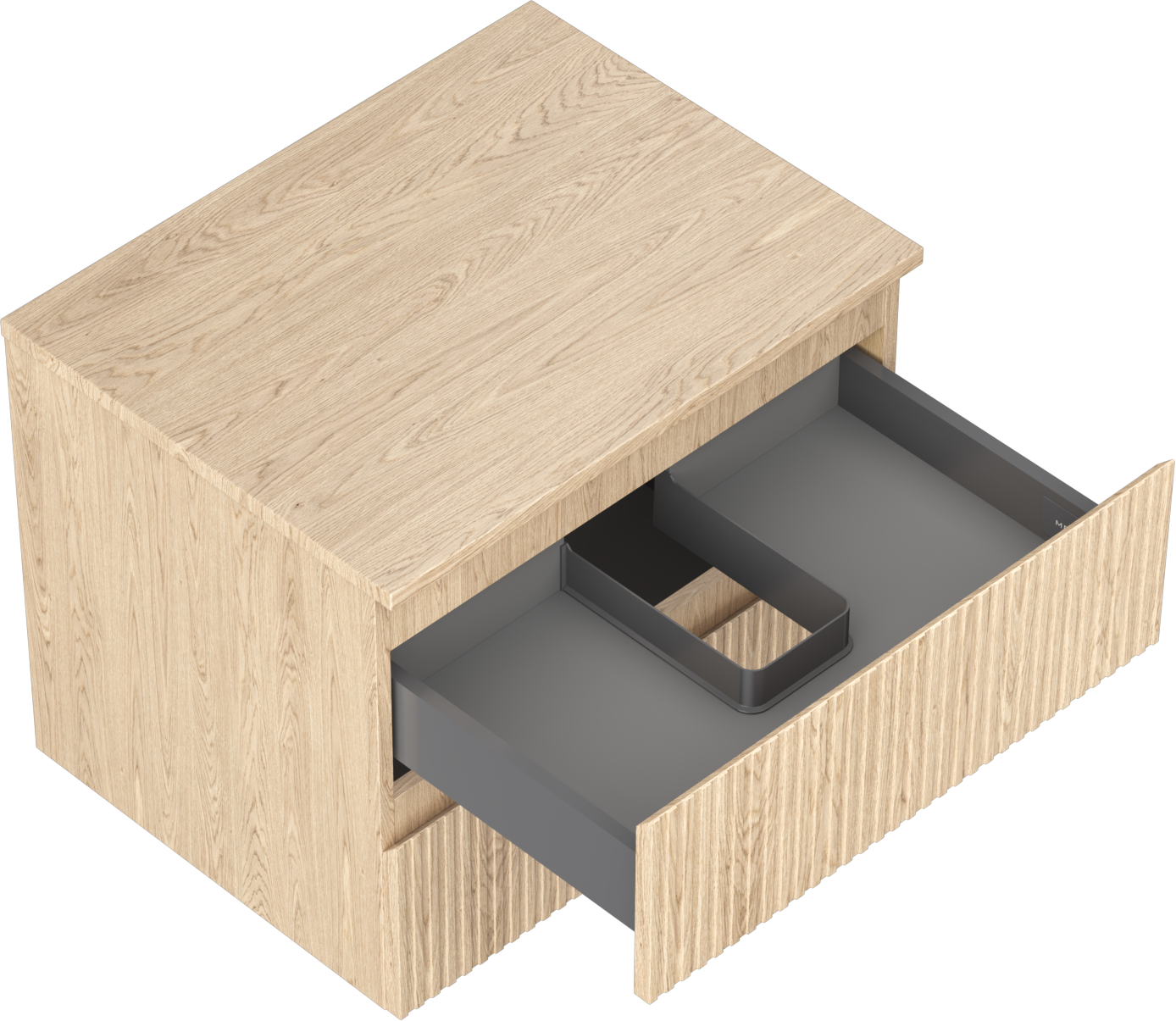 Decupajul în sertar este proiectat în așa fel încât să acomodeze sifonul, care este esențial în instalațiile de lavoare. Datorită acestui fapt, mobila poate fi montată complet funcțională, fără a fi necesară renunțarea la spațiul din sertar în favoarea instalației.