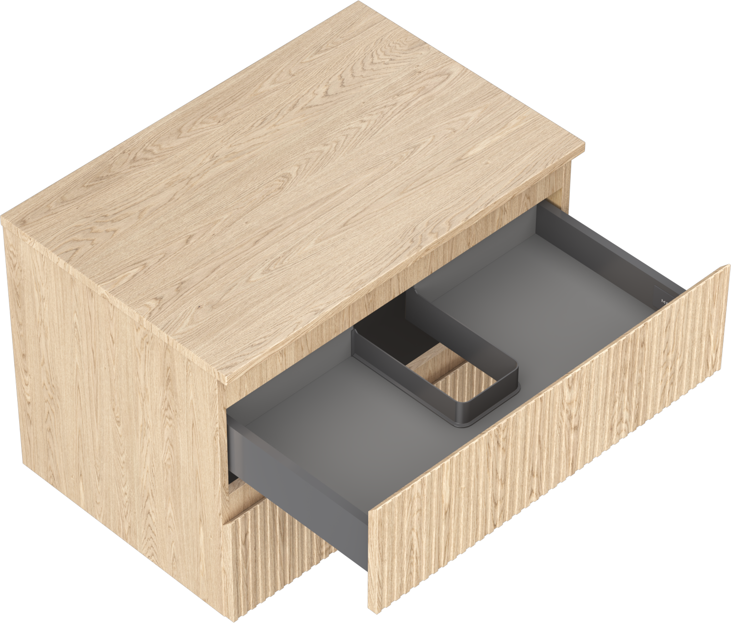 Decupajul în sertar este proiectat în așa fel încât să acomodeze sifonul, care este esențial în instalațiile de lavoare. Datorită acestui fapt, mobila poate fi montată complet funcțională, fără a fi necesară renunțarea la spațiul din sertar în favoarea instalației.