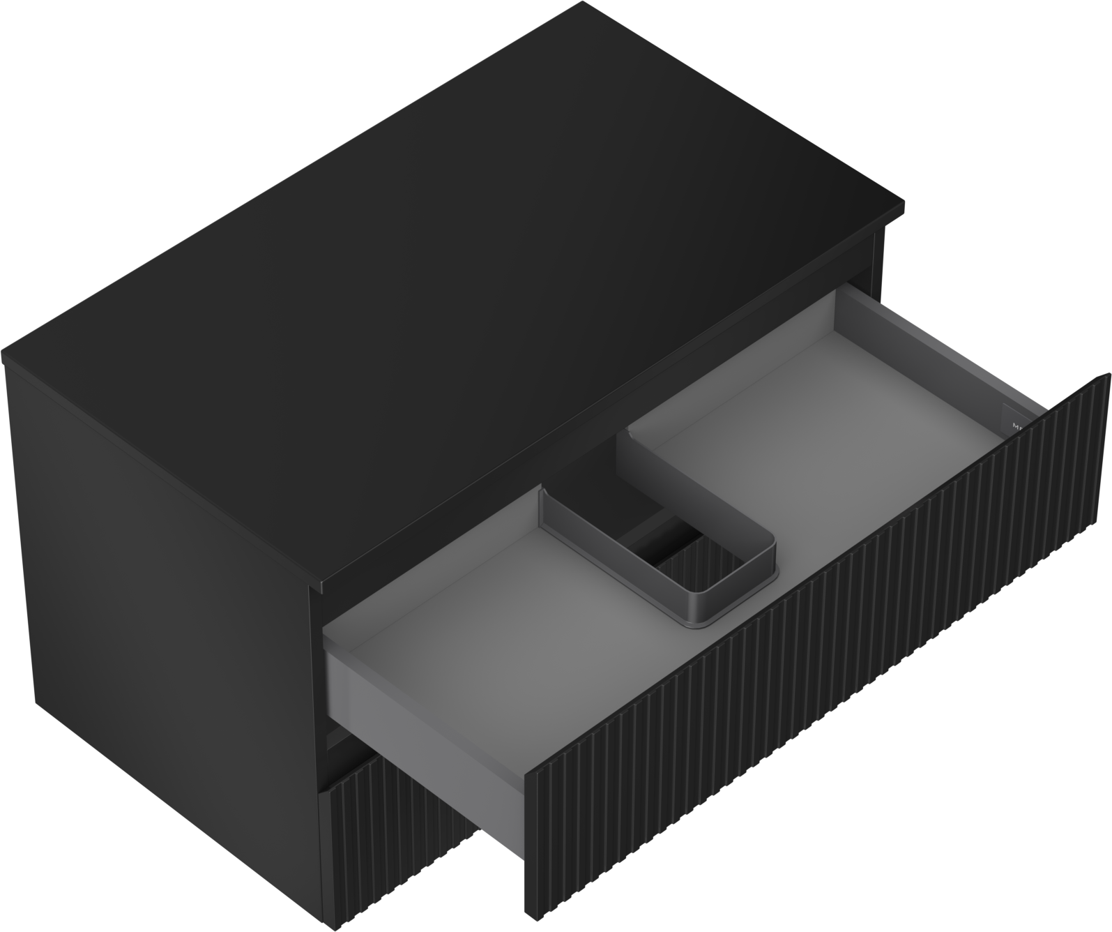 Decupajul în sertar este proiectat în așa fel încât să acomodeze sifonul, care este esențial în instalațiile de lavoare. Datorită acestui fapt, mobila poate fi montată complet funcțională, fără a fi necesară renunțarea la spațiul din sertar în favoarea instalației.