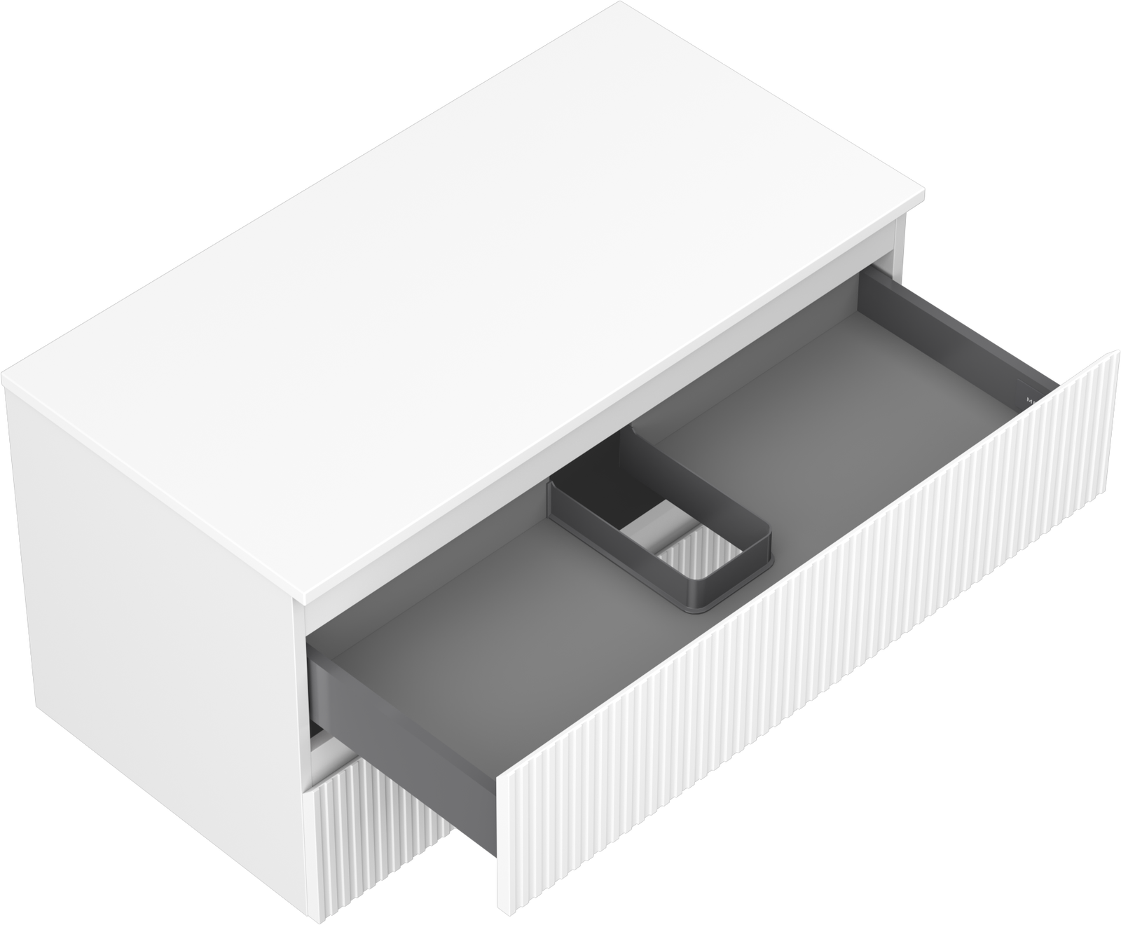 Decupajul în sertar este proiectat în așa fel încât să acomodeze sifonul, care este esențial în instalațiile de lavoare. Datorită acestui fapt, mobila poate fi montată complet funcțională, fără a fi necesară renunțarea la spațiul din sertar în favoarea instalației.