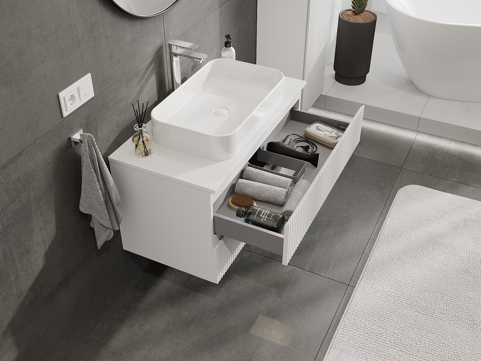Mobilierul nostru modular pentru baie poate fi combinat în diverse configurații de culori, permițând personalizarea completă. Puteți alege atât aspectul, cât și funcțiile fiecărui element, ceea ce permite adaptarea mobilierului la preferințele dvs. stilistice și funcționale.