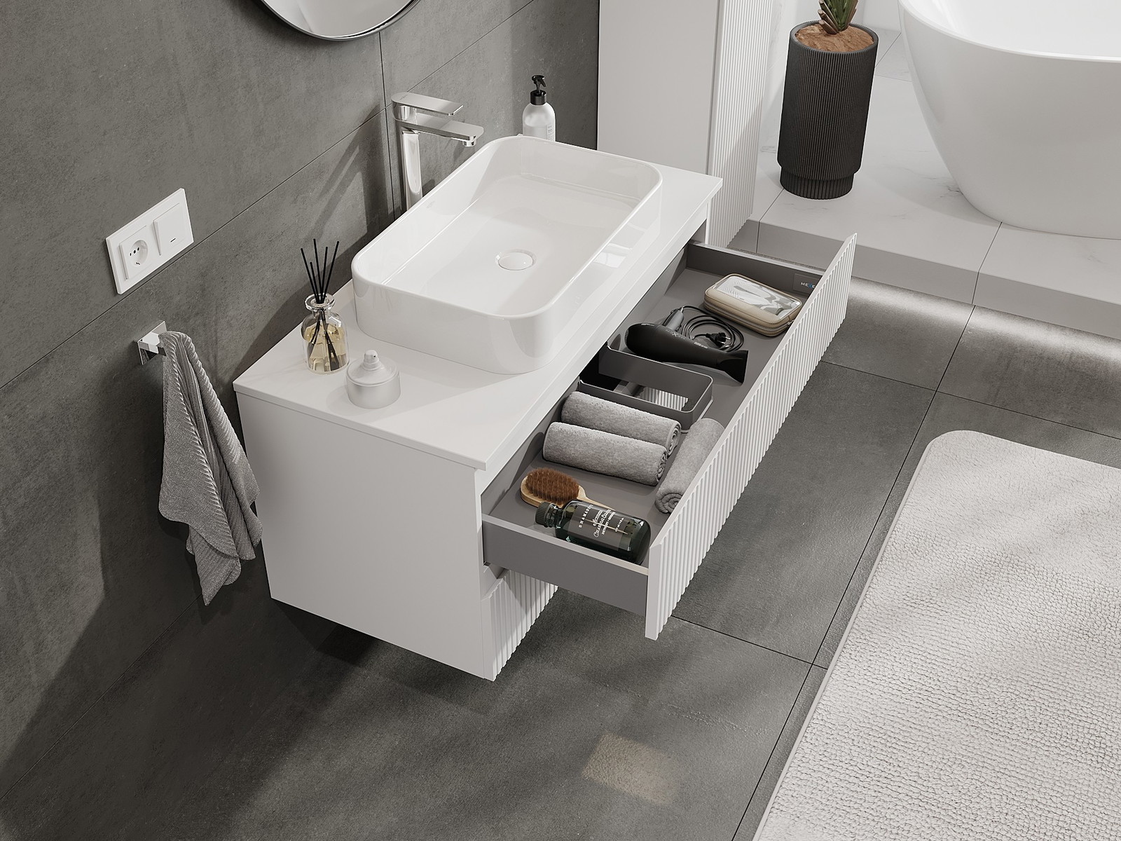 Mobilierul nostru modular pentru baie poate fi combinat în diverse configurații de culori, permițând personalizarea completă. Puteți alege atât aspectul, cât și funcțiile fiecărui element, ceea ce permite adaptarea mobilierului la preferințele dvs. stilistice și funcționale.