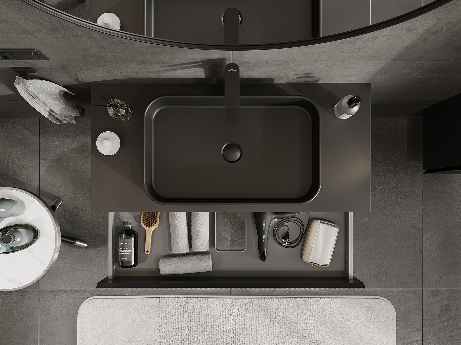 Decupajul în sertar este proiectat în așa fel încât să acomodeze sifonul, care este esențial în instalațiile de lavoare. Datorită acestui fapt, mobila poate fi montată complet funcțională, fără a fi necesară renunțarea la spațiul din sertar în favoarea instalației.