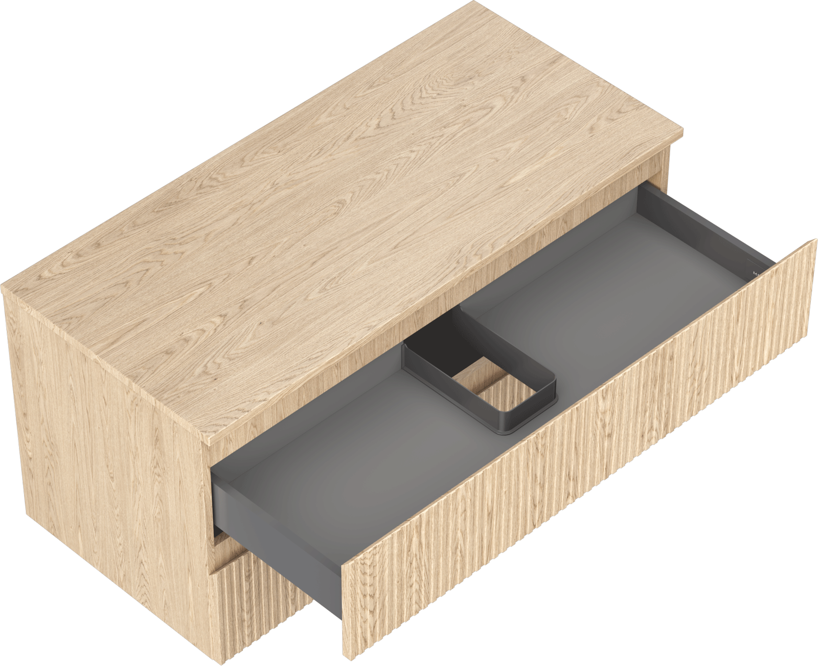 Decupajul în sertar este proiectat în așa fel încât să acomodeze sifonul, care este esențial în instalațiile de lavoare. Datorită acestui fapt, mobila poate fi montată complet funcțională, fără a fi necesară renunțarea la spațiul din sertar în favoarea instalației.