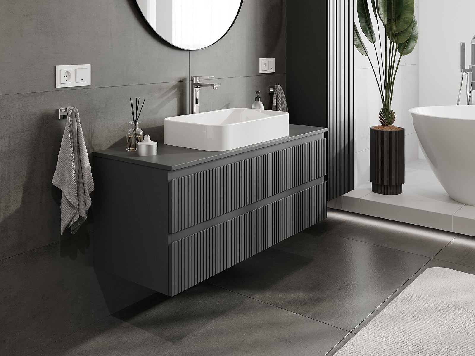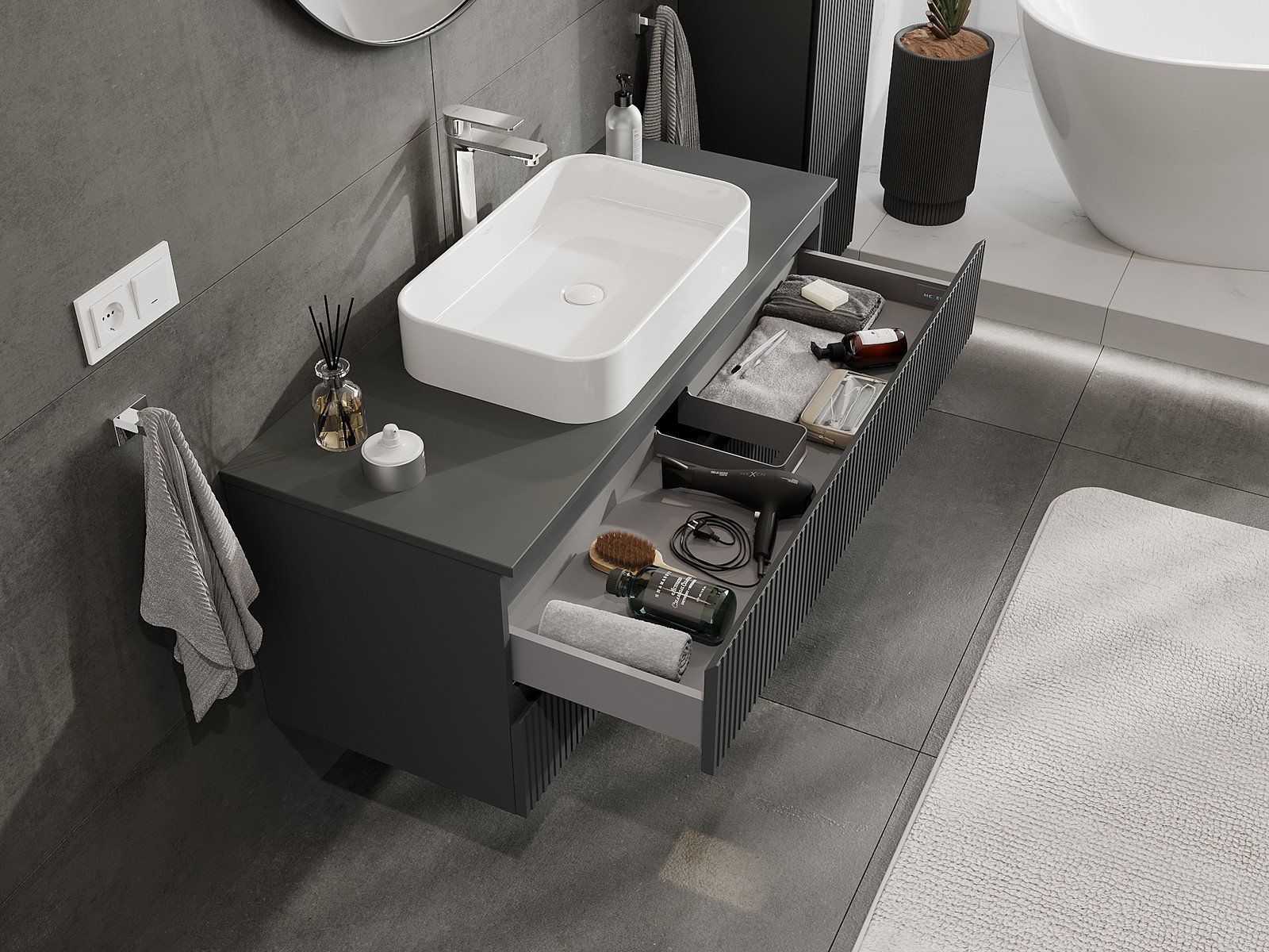 Mobilierul nostru modular pentru baie poate fi combinat în diverse configurații de culori, permițând personalizarea completă. Puteți alege atât aspectul, cât și funcțiile fiecărui element, ceea ce permite adaptarea mobilierului la preferințele dvs. stilistice și funcționale.