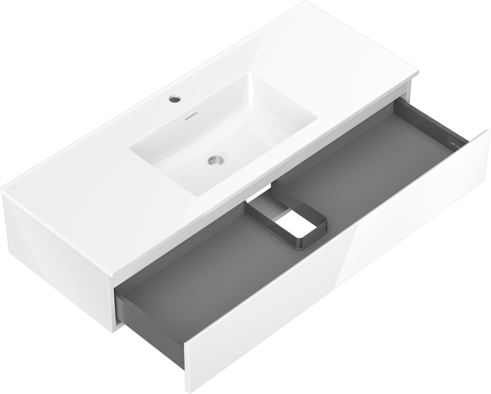 Decupajul în sertar este proiectat în așa fel încât să acomodeze sifonul, care este esențial în instalațiile de lavoare. Datorită acestui fapt, mobila poate fi montată complet funcțională, fără a fi necesară renunțarea la spațiul din sertar în favoarea instalației.