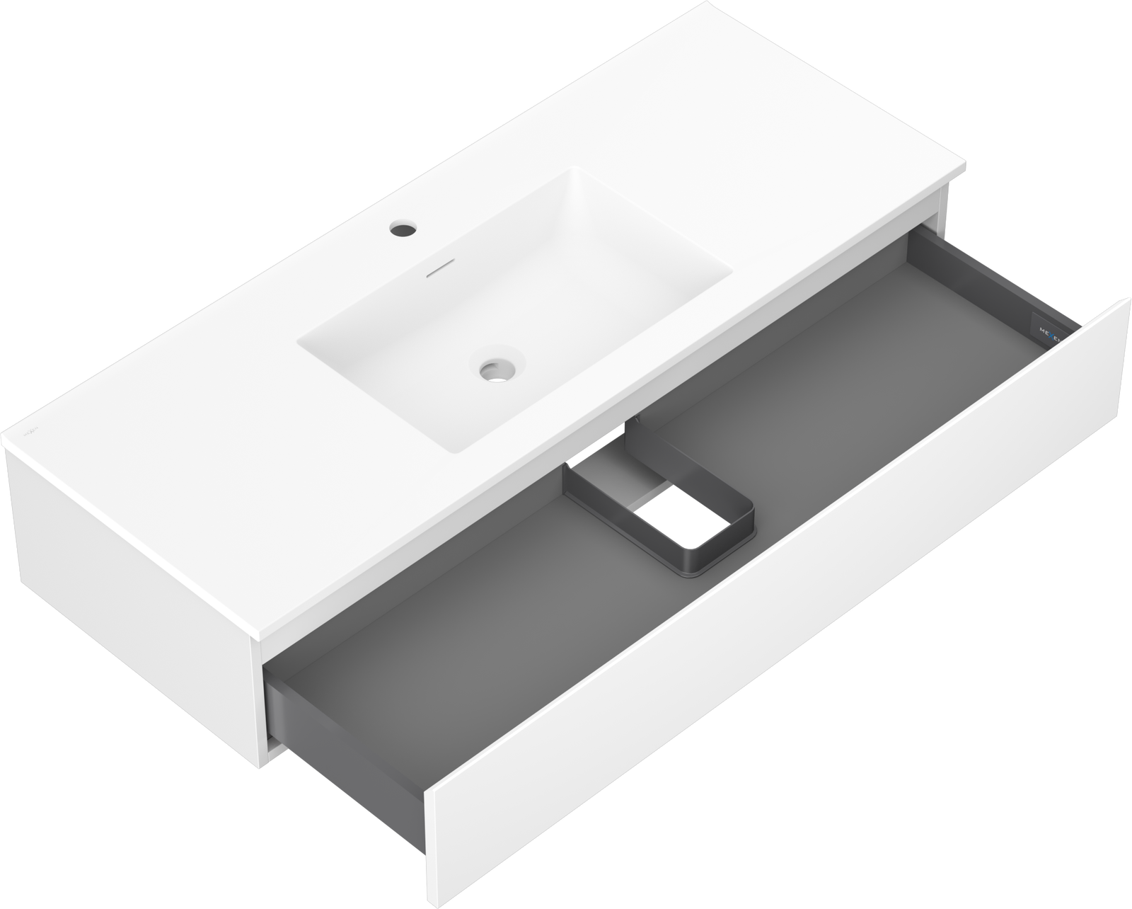 Decupajul în sertar este proiectat în așa fel încât să acomodeze sifonul, care este esențial în instalațiile de lavoare. Datorită acestui fapt, mobila poate fi montată complet funcțională, fără a fi necesară renunțarea la spațiul din sertar în favoarea instalației.